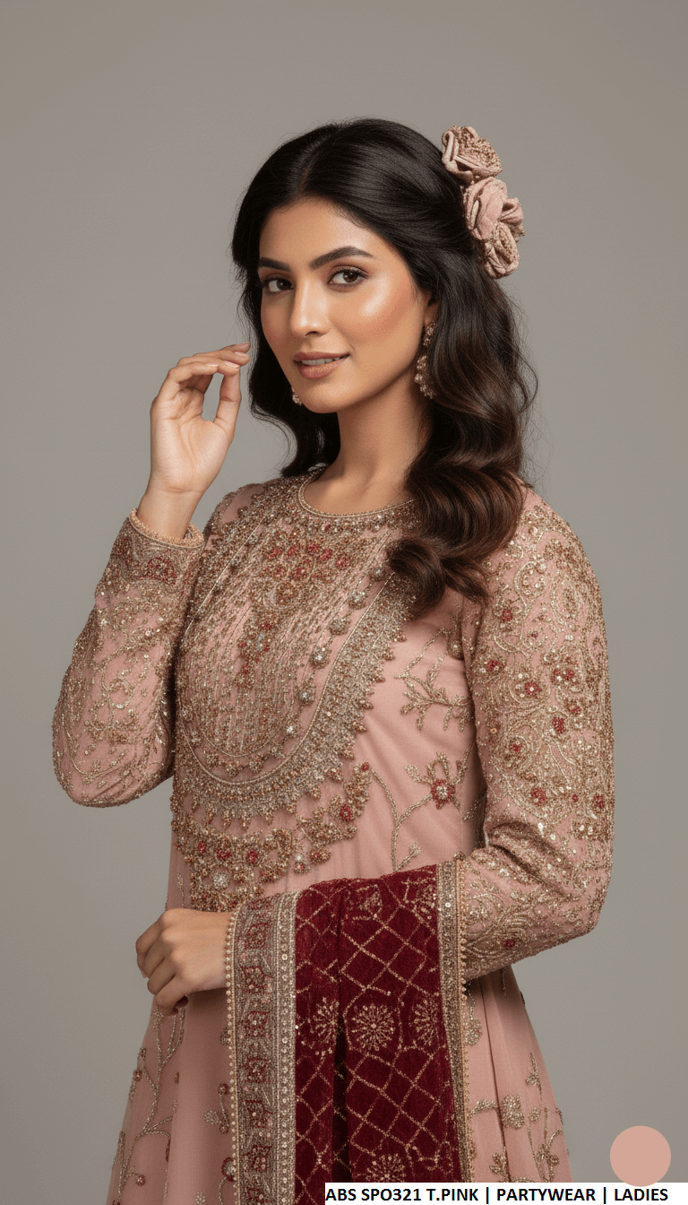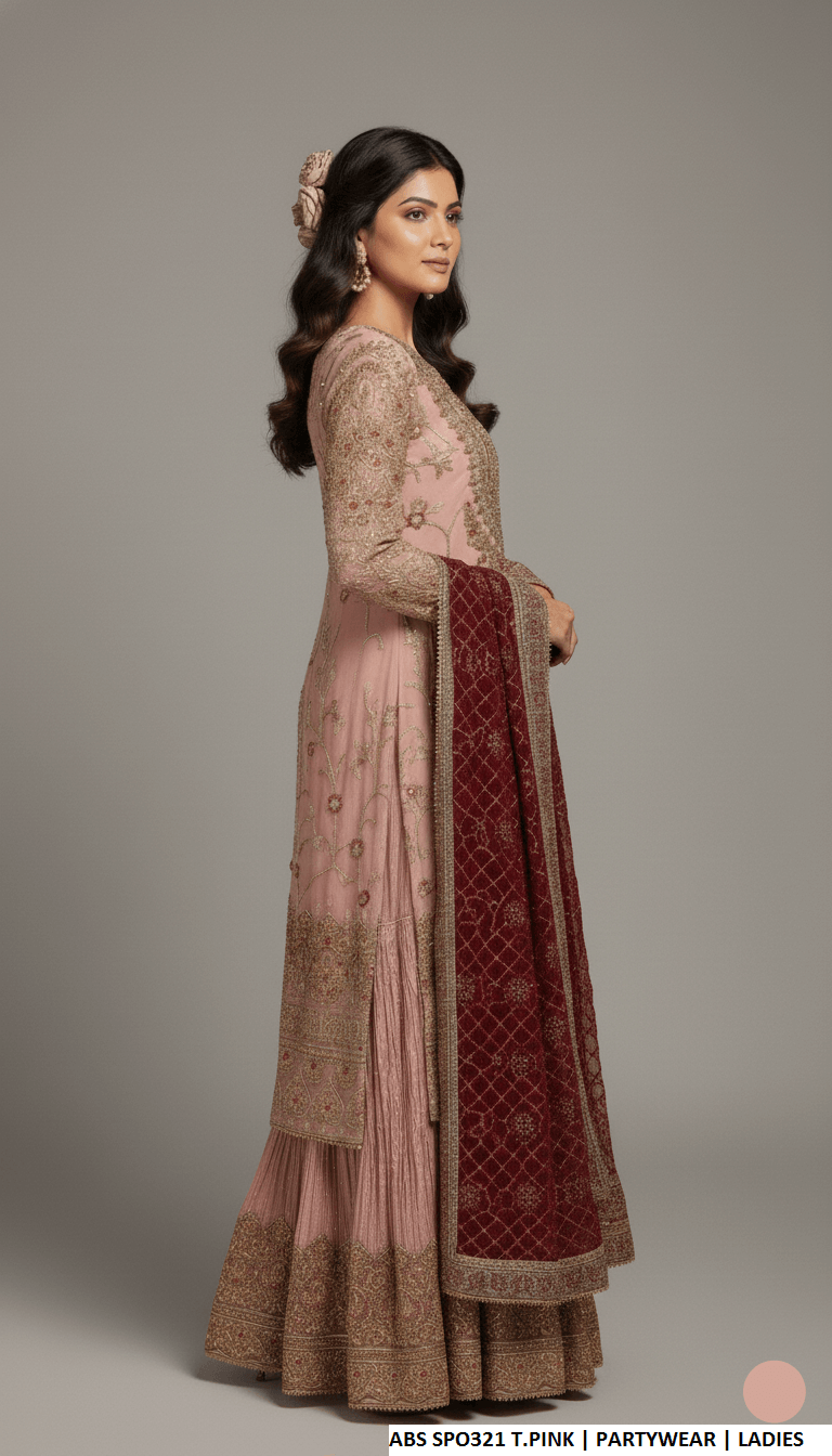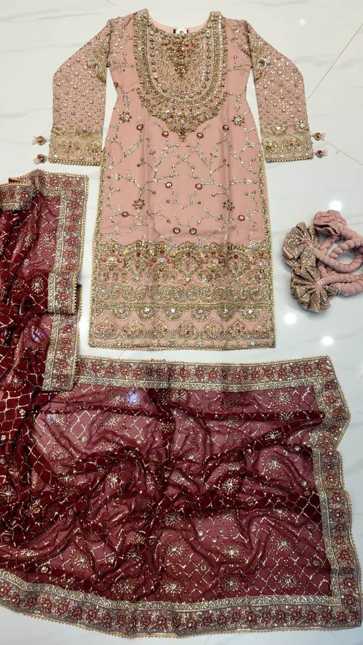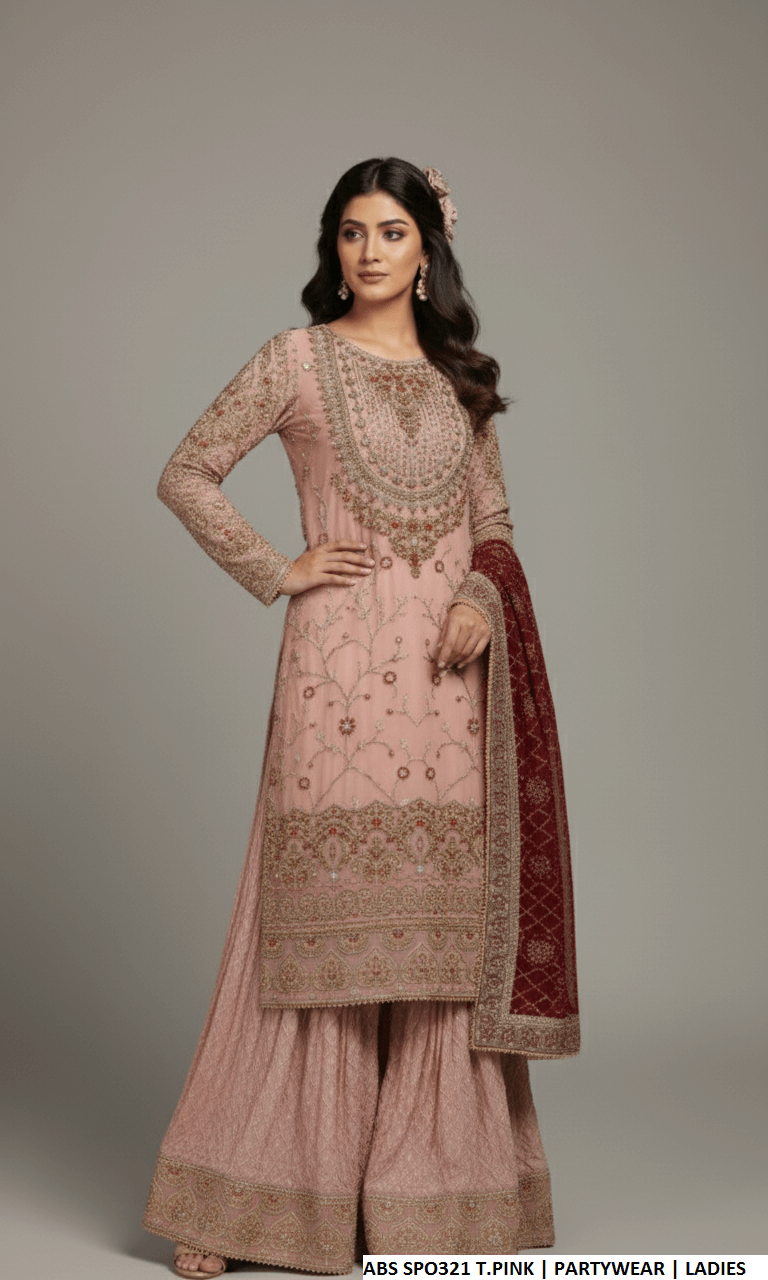 This elegant three-piece outfit features a chiffon straight shirt paired with stylish crushed palazzo trousers crafted from grip fabric, along with a matching chiffon dupatta. The combination offers a modern yet graceful look, making it an excellent choice for festive occasions, semi-formal events, and evening wear. With a shirt length of 41/43 inches and a premium weight of approximately 1.400 kg, this outfit provides both comfort and a luxurious drape.