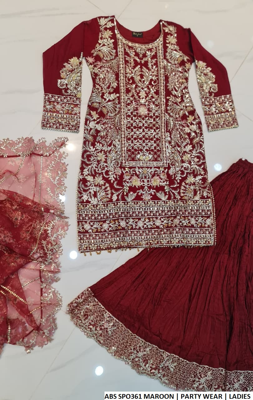 This beautiful outfit features a straight shirt made from premium chiffon fabric, paired with a comfortable viscose crush plazo for a stylish and flowy look. The elegant organza dupatta adds a graceful touch to the ensemble. The shirt length ranges from 40 to 42 inches, offering a flattering silhouette. With a total weight of 1.250 kg, this outfit is perfect for festive events, formal gatherings, and special occasions.