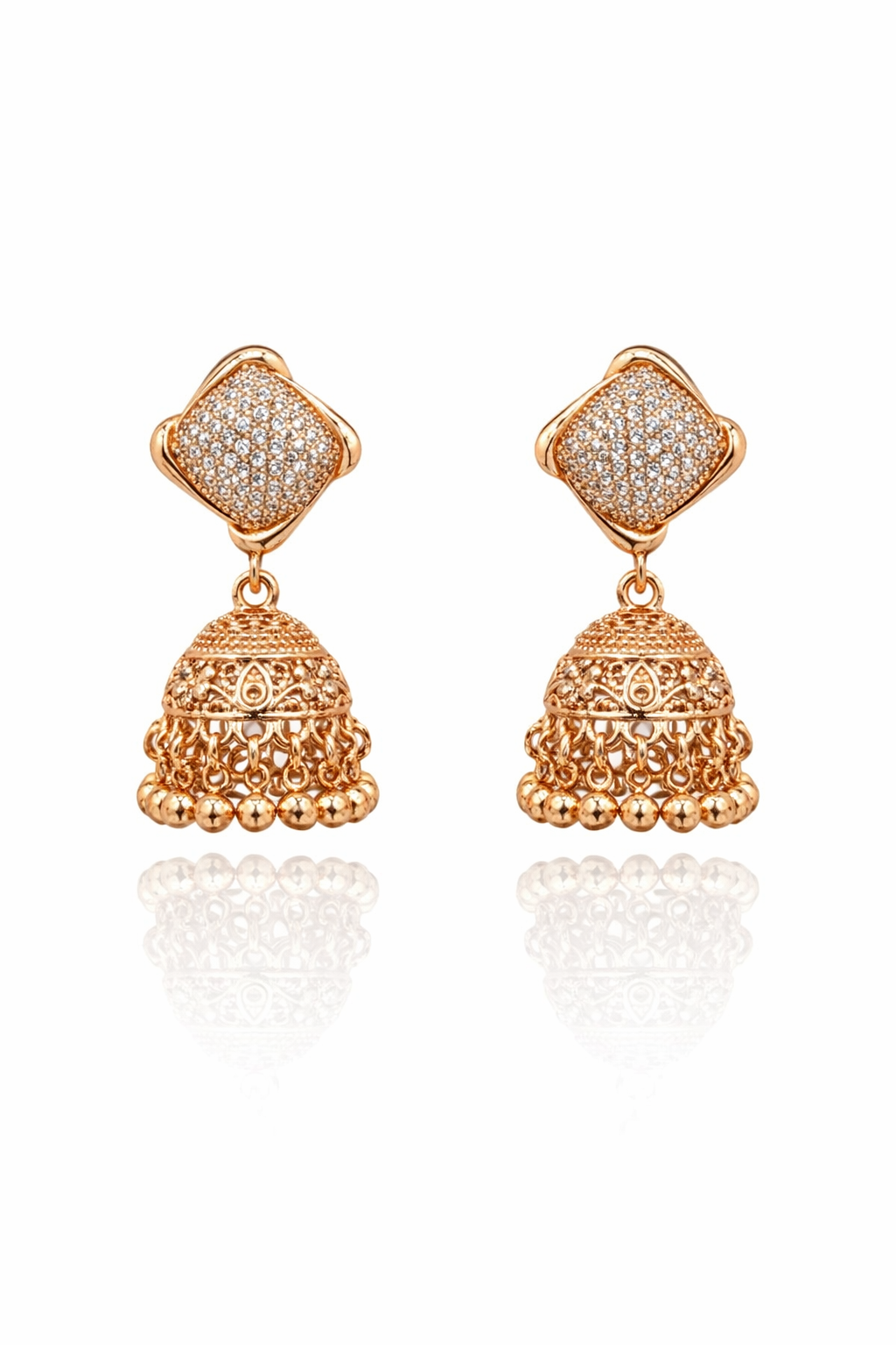 Elevate your elegance with these stunning rose gold jhumka earrings, featuring a sparkling diamond-cut square stud and intricately crafted traditional bell drop. Designed for weddings, festive occasions, and formal events, this premium piece blends timeless heritage with modern luxury. Ultra-fine detailing and high-polish finish make it a perfect statement accessory for your special look.