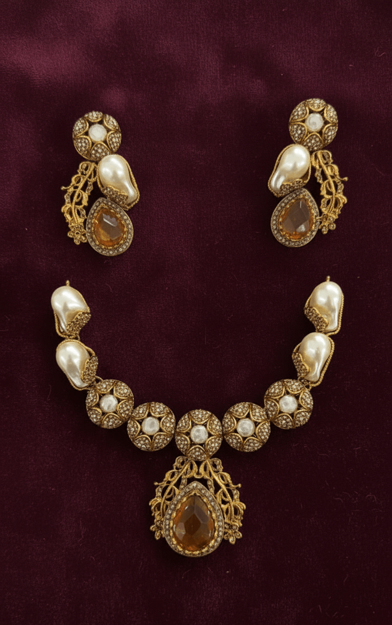 Introducing JW365, an elegant antique-style necklace set featuring bold pearl elements paired with rich stone detailing in a classic gold-tone finish. The statement centerpiece and sculpted pearl accents create a powerful heritage look inspired by traditional royal jewelry.