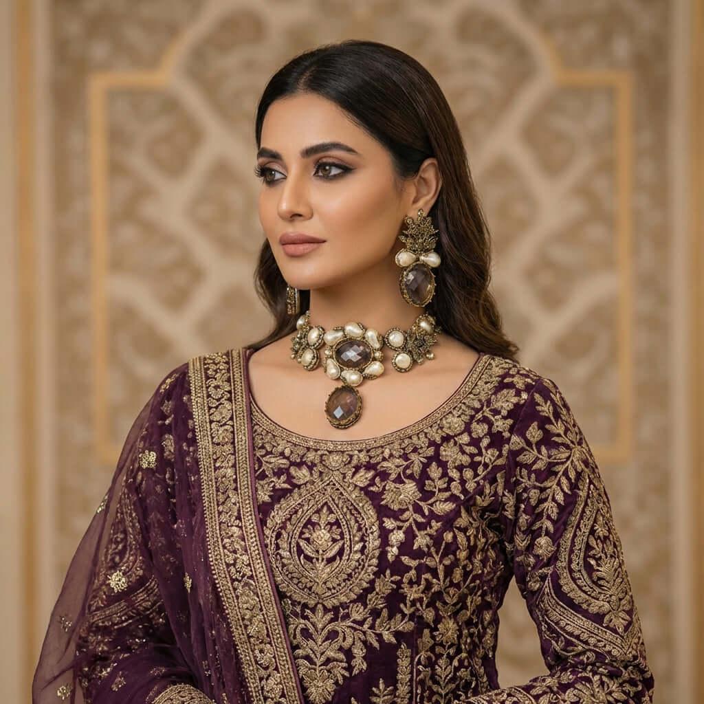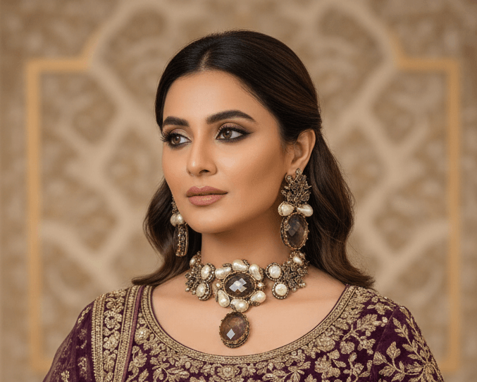 Paired with matching statement earrings, the set showcases elegant detailing and a balanced design that enhances both traditional and modern outfits. Perfect for festive occasions, formal events, and evening wear, this set delivers a luxurious look that stands out effortlessly.