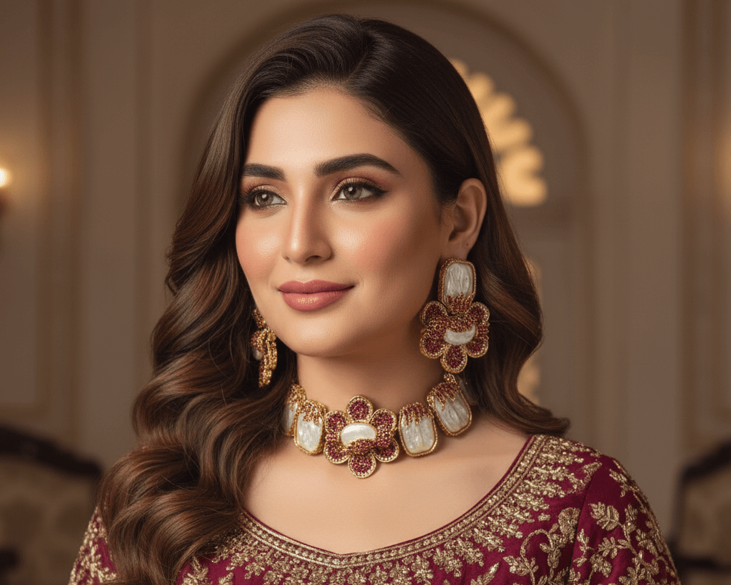 The matching floral earrings mirror the choker’s design, creating a perfectly coordinated set that feels both luxurious and eye-catching. Ideal for weddings, festive occasions, and formal events, this set adds a confident and sophisticated touch to traditional and modern outfits alike.