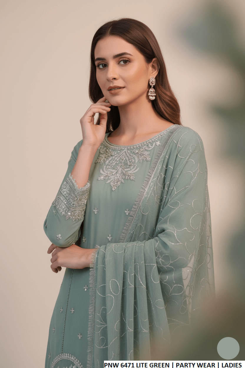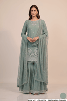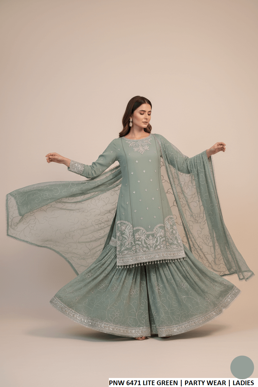This elegant outfit is crafted from soft and flowy chiffon, including the shirt, trouser, and dupatta. Featuring a short shirt paired with a stylish sharara, the shirt measures 34 to 36 inches in length, and the complete ensemble weighs approximately 0.850 Kg, offering both comfort and sophistication.
