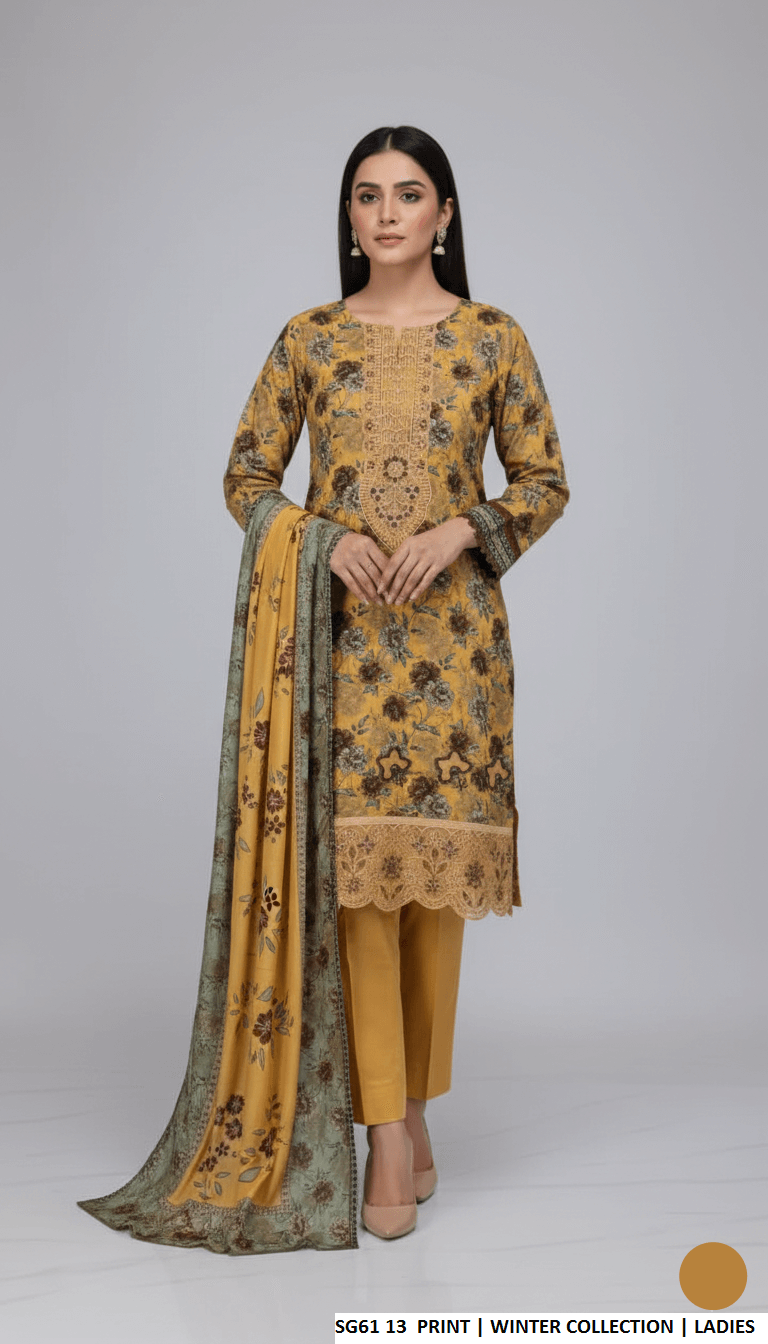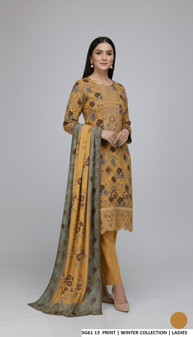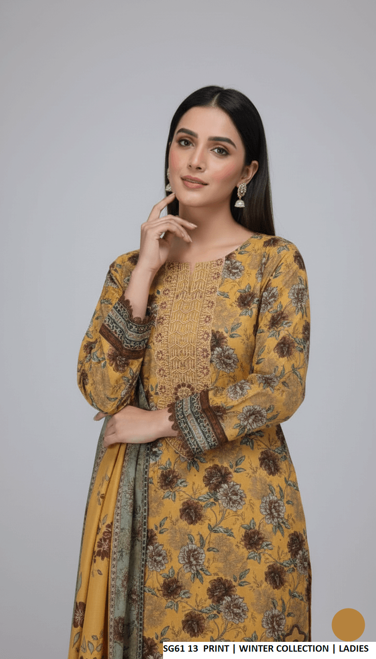 This elegant outfit is crafted with premium Slub Khaddar fabric. The shirt and trousers are made from Slub Khaddar, offering comfort and durability, while the dupatta features a warm Khaddar shawl fabric. Designed in a classic straight shirt style, the shirt length measures between 41 to 43 inches, making it suitable for a graceful and modest look. The total outfit weight is approximately 0.850 kg, ideal for seasonal wear.