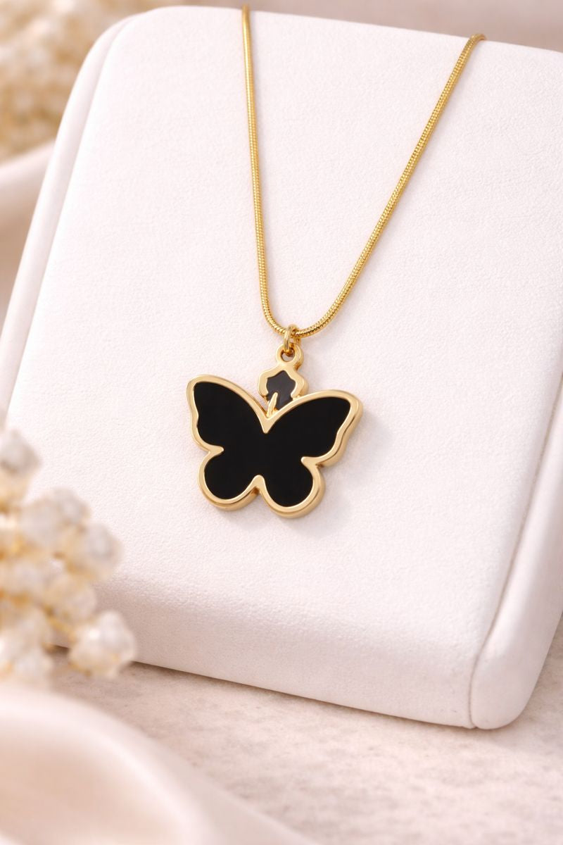The Black Butterfly Pendant Chain is a striking blend of elegance and modern style. Crafted with a sleek gold-tone stainless steel chain, it features a bold black butterfly pendant that symbolizes transformation, freedom, and grace.