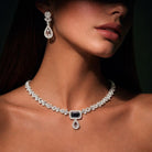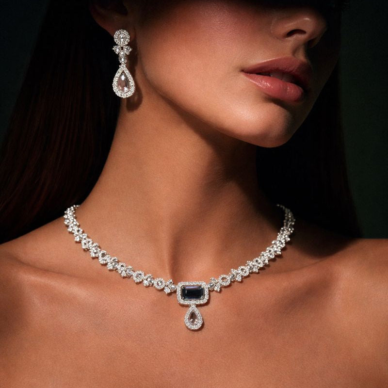 Add timeless elegance to your jewellery collection with this classic diamond-style necklace set. Designed with a refined chain of sparkling stones, the necklace features a beautifully centered square-cut drop with a delicate teardrop finish, creating a graceful and sophisticated look. The matching drop earrings perfectly complement the necklace, making this set ideal for formal occasions.