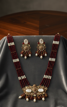 Introducing JW209, an elegant maala-style necklace set crafted with deep ruby-toned beads, pearl accents, and a beautifully detailed antique gold centerpiece. The multi-strand design is finished with classic pearl drops, creating a rich heritage look inspired by traditional bridal jewelry.