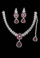 Add a touch of timeless glamour to your look with this stunning ruby drop necklace set, designed to make a refined yet striking statement. The necklace features an elegant linked pattern leading to a beautifully crafted floral centerpiece, finished with a graceful teardrop accent that adds depth and brilliance.