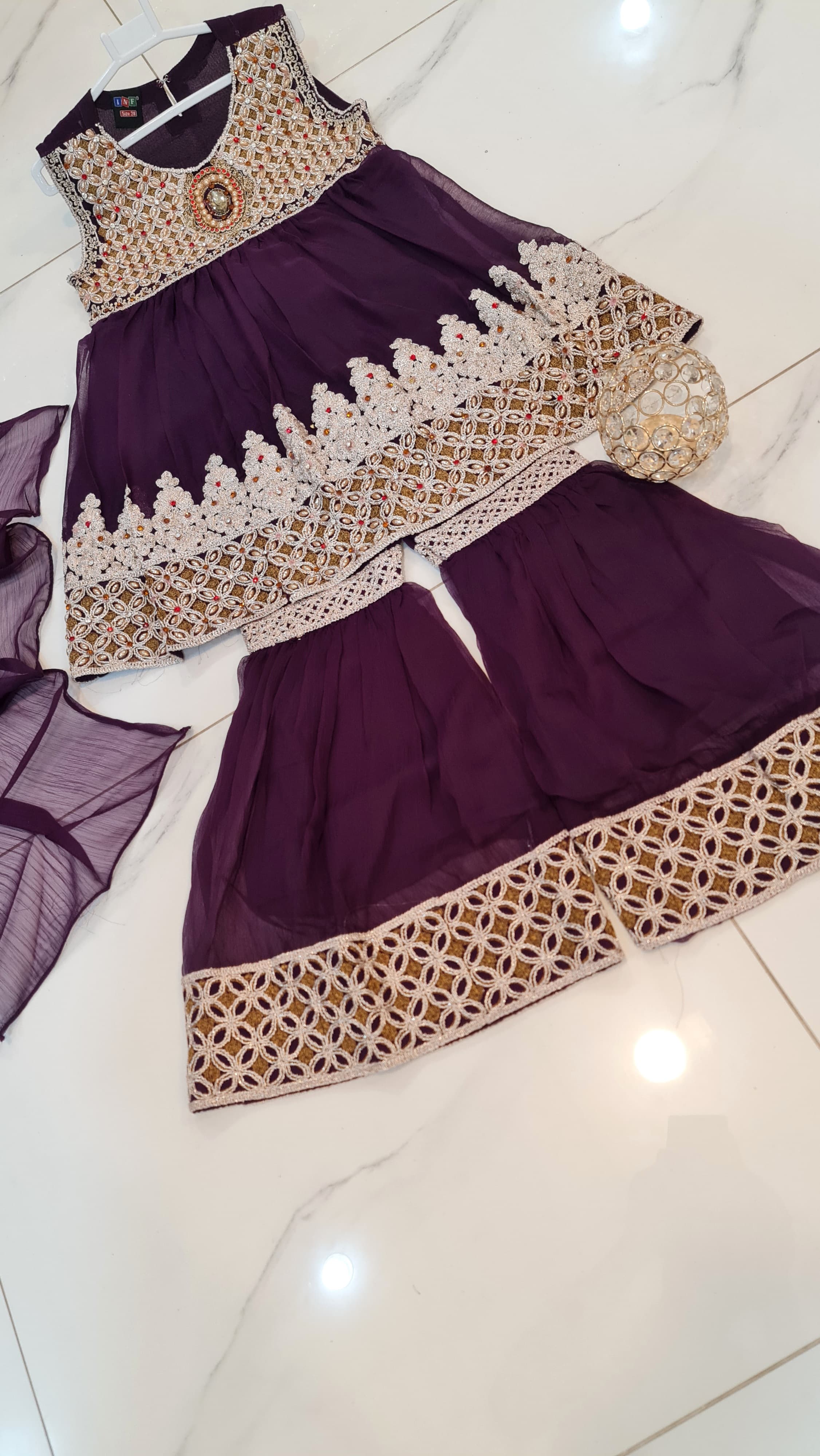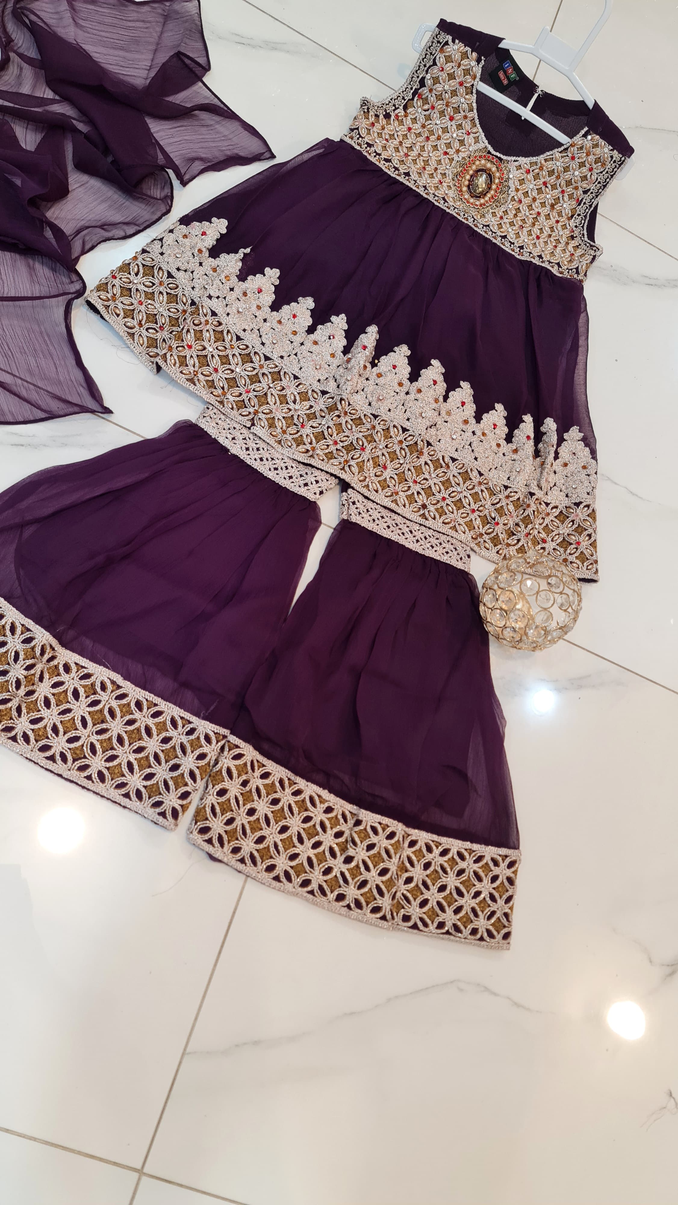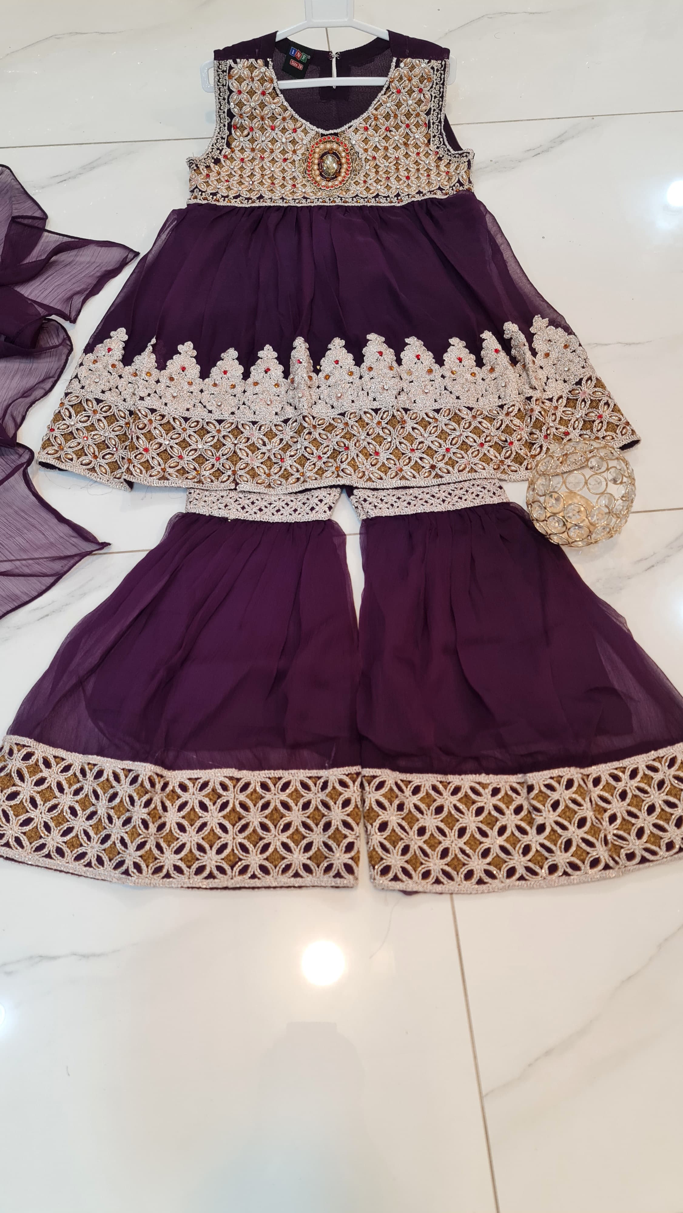 - This stunning outfit is made from delicate chiffon fabric, with both the shirt and trouser crafted from the same lightweight, elegant material. The ensemble features a beautiful frock paired with a stylish gharara, offering a perfect blend of traditional and contemporary charm. The chiffon dupatta completes the look with its airy, flowing design, adding an extra touch of sophistication. Weighing 0.650 kg, this outfit is not only graceful but also comfortable, making it an excellent choice for special occasions.