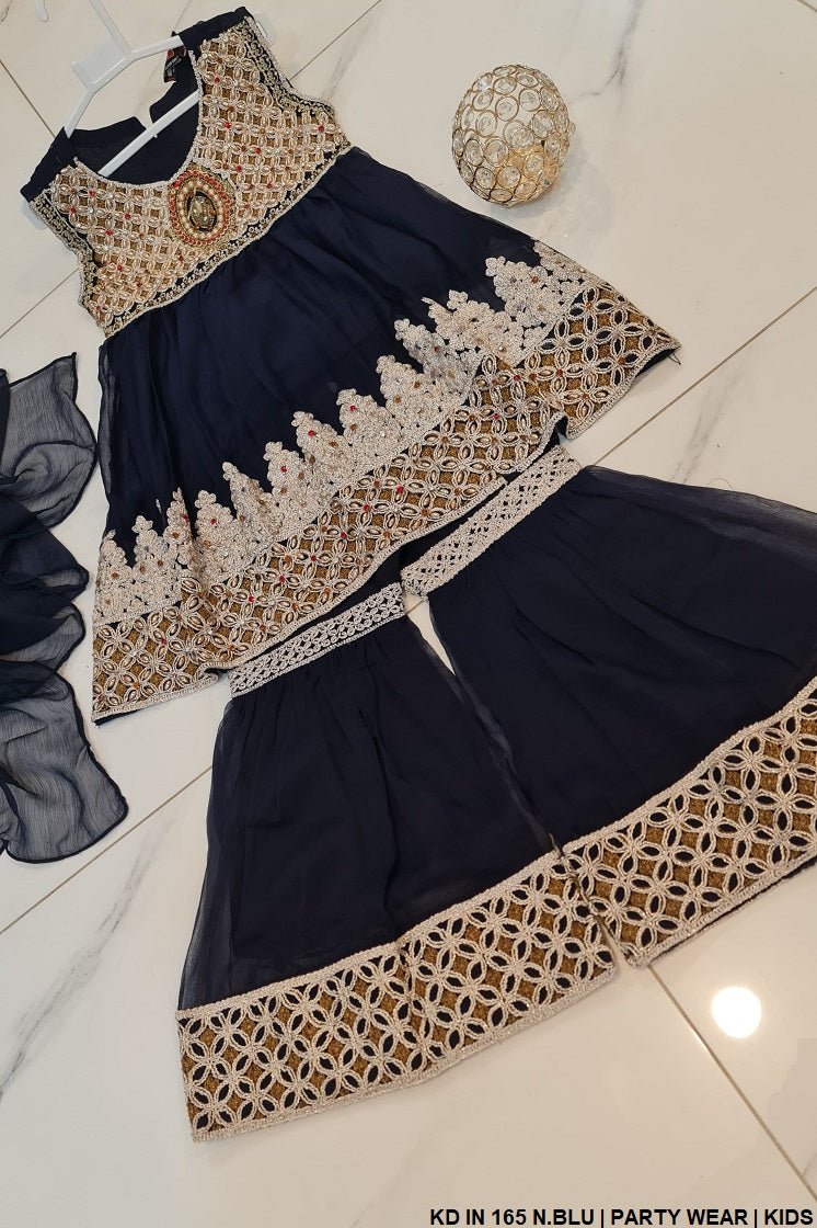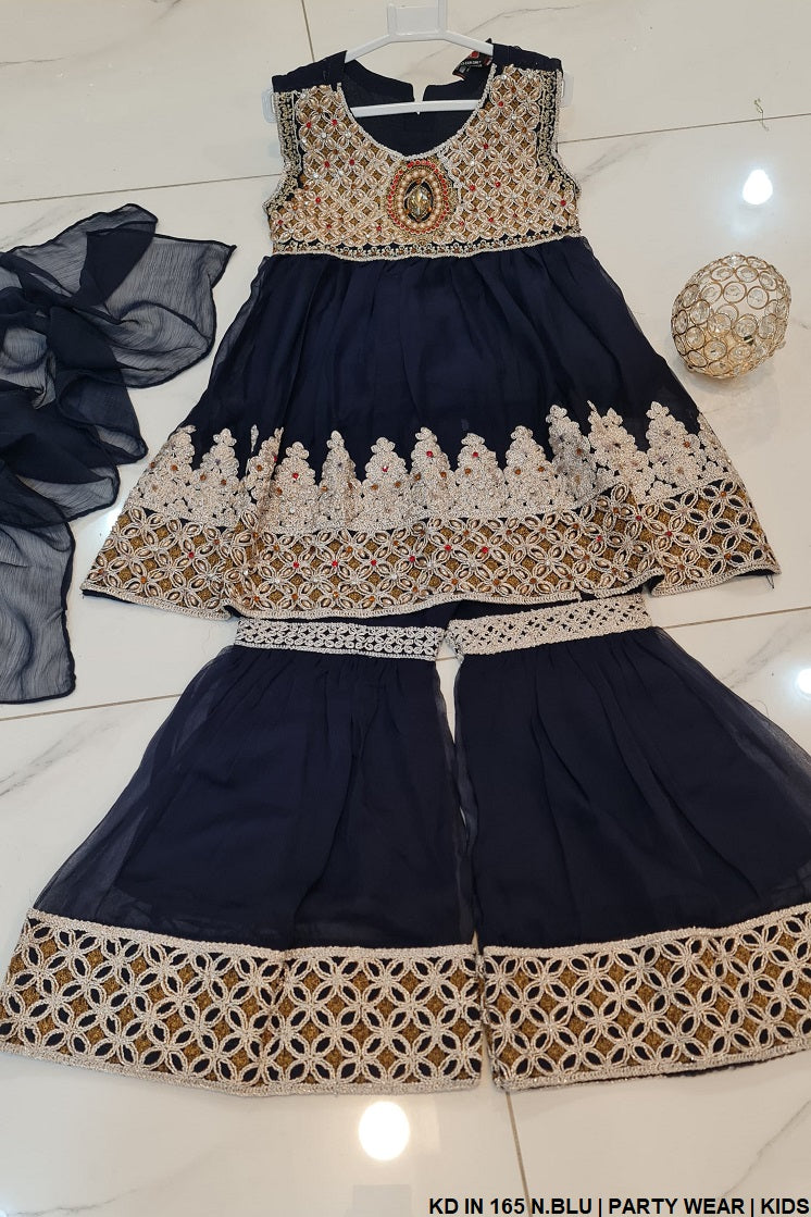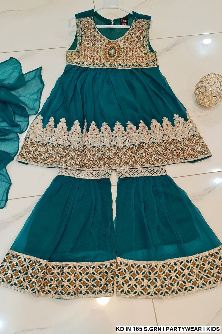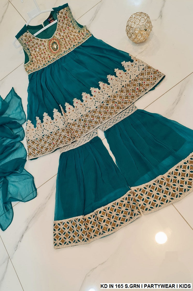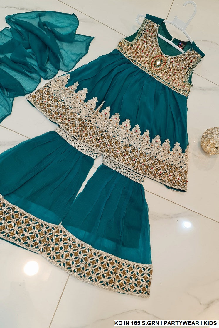 - This stunning outfit is made from delicate chiffon fabric, with both the shirt and trouser crafted from the same lightweight, elegant material. The ensemble features a beautiful frock paired with a stylish gharara, offering a perfect blend of traditional and contemporary charm. The chiffon dupatta completes the look with its airy, flowing design, adding an extra touch of sophistication. Weighing 0.650 kg, this outfit is not only graceful but also comfortable, making it an excellent choice for special occasions.