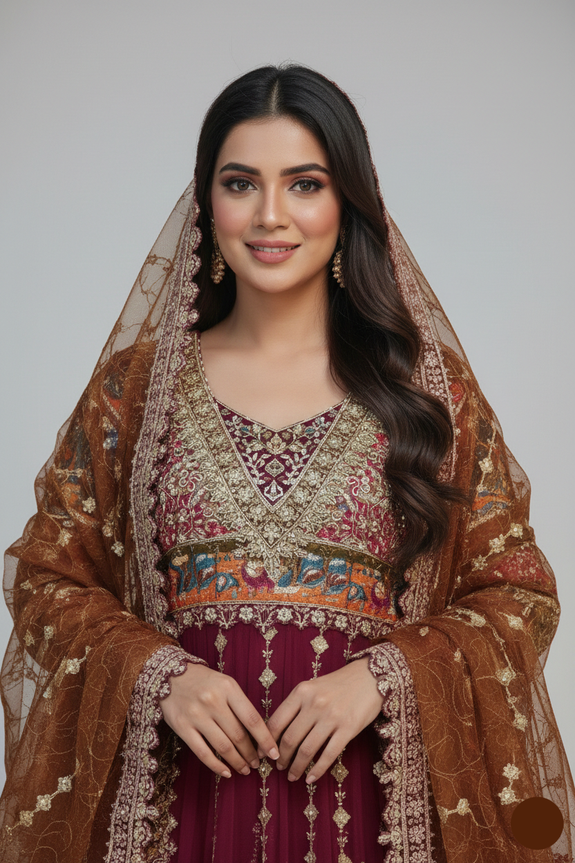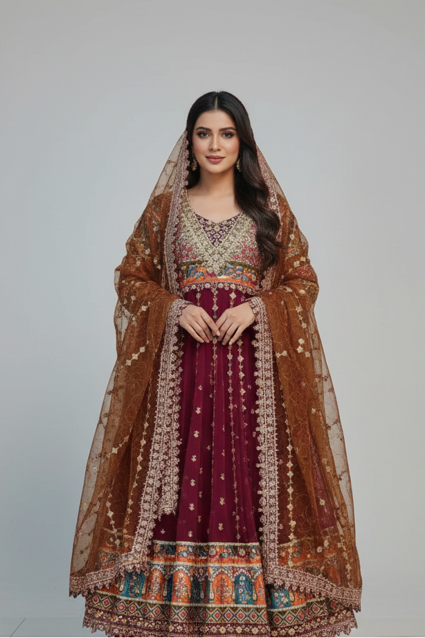 This stunning ensemble features a frock with plazo, combining elegance with contemporary charm. The shirt is crafted from delicate net fabric, creating a soft and graceful look, while the trouser is made from viscose, ensuring a comfortable and fluid fit. Completing the outfit is a sheer organza dupatta, adding a touch of sophistication. With a shirt length ranging from 50 to 52 inches, this outfit offers a flattering, flowy silhouette. Weighing approximately 1.500 kg, it strikes the perfect balance between style and ease, making it an ideal choice for special occasions.