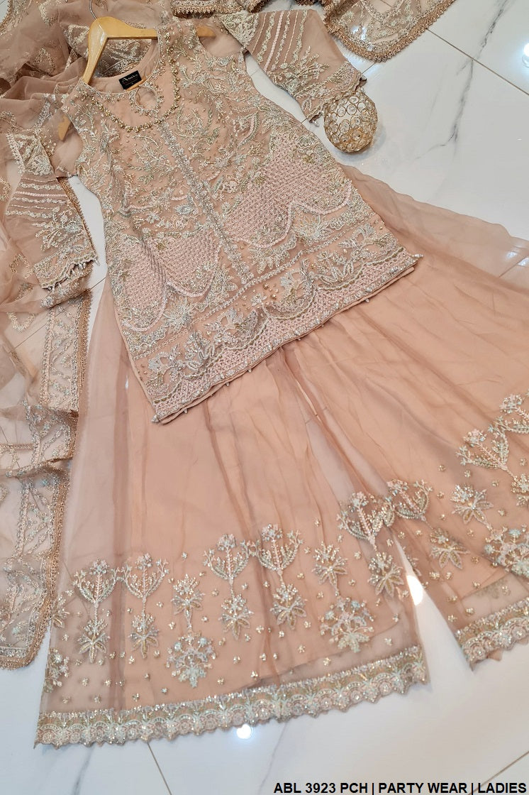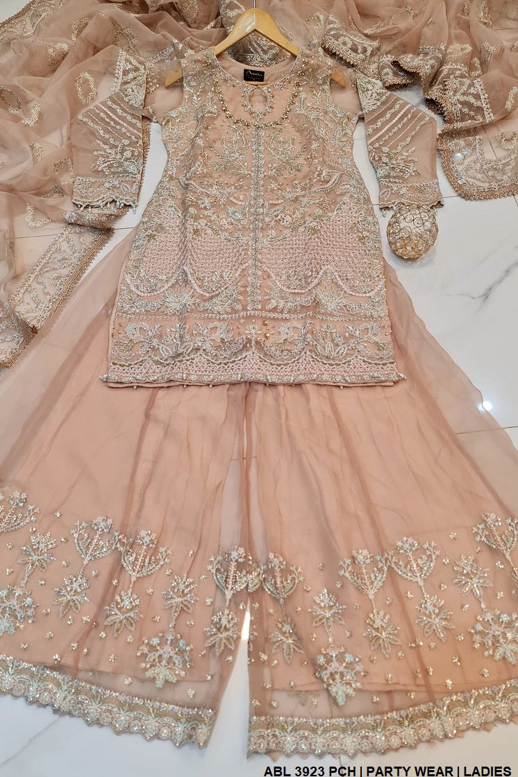 This elegant ensemble features a straight organza shirt, offering a luxurious and sophisticated look with a length ranging from 37 to 39 inches. Paired with matching organza plazo trousers, the outfit creates a flowy and graceful silhouette. Completing the set is a delicate organza dupatta, adding an ethereal charm. Weighing 1.250 kg, this ensemble is perfect for formal occasions, exuding timeless elegance and refined style.