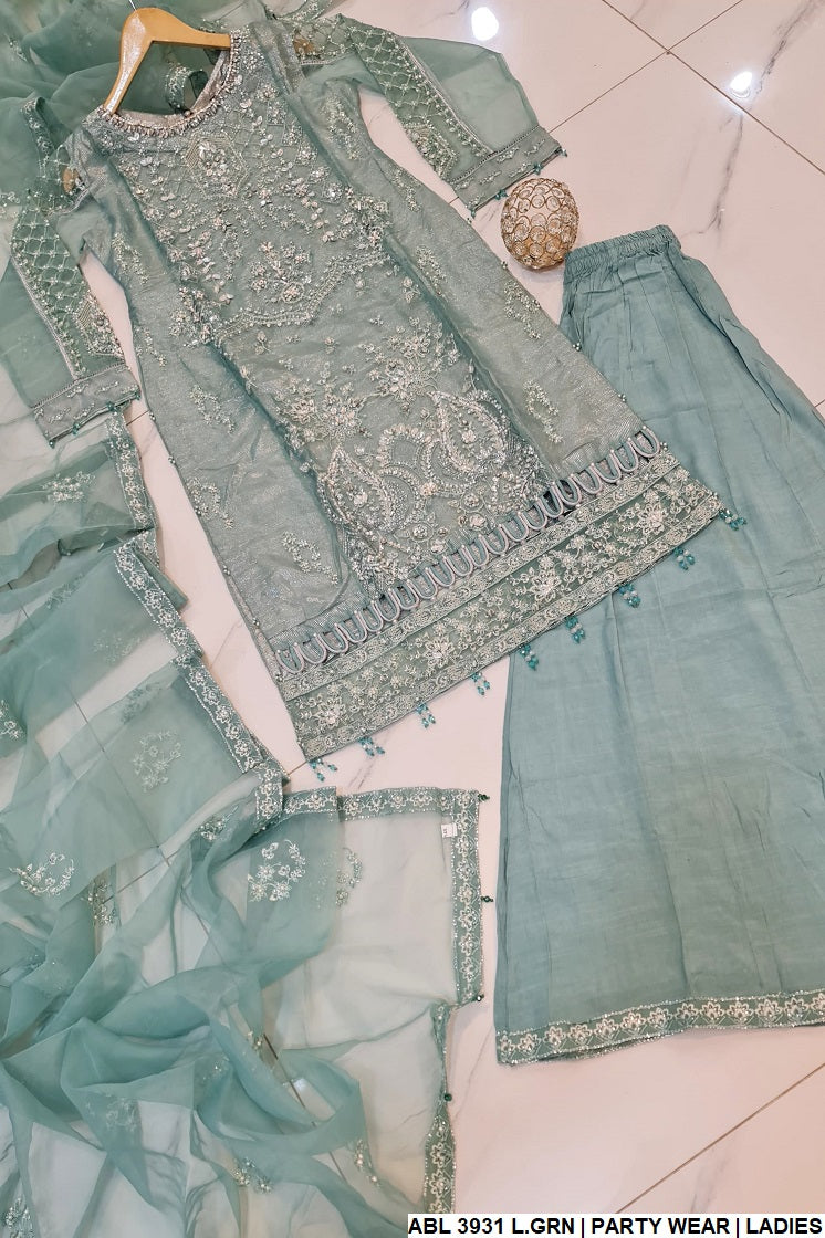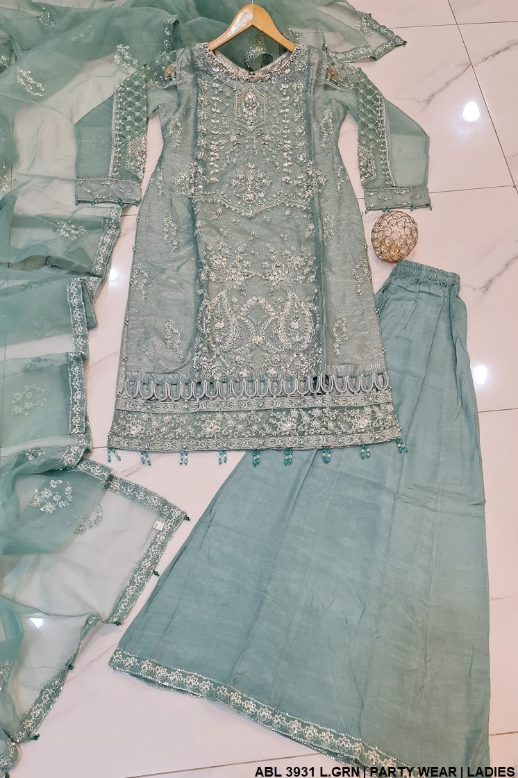 This elegant ensemble features a straight organza shirt, offering a luxurious and graceful appeal with a length ranging from 43 to 45 inches. Paired with grip fabric plazo trousers, the outfit ensures a comfortable yet stylish look. Completing the ensemble is a matching organza dupatta, adding an element of sophistication and charm. Weighing 0.900 kg, this outfit is perfect for semi-formal and formal occasions, combining elegance with effortless grace.