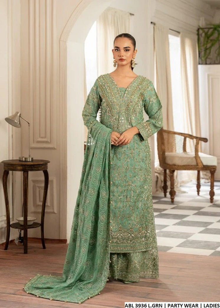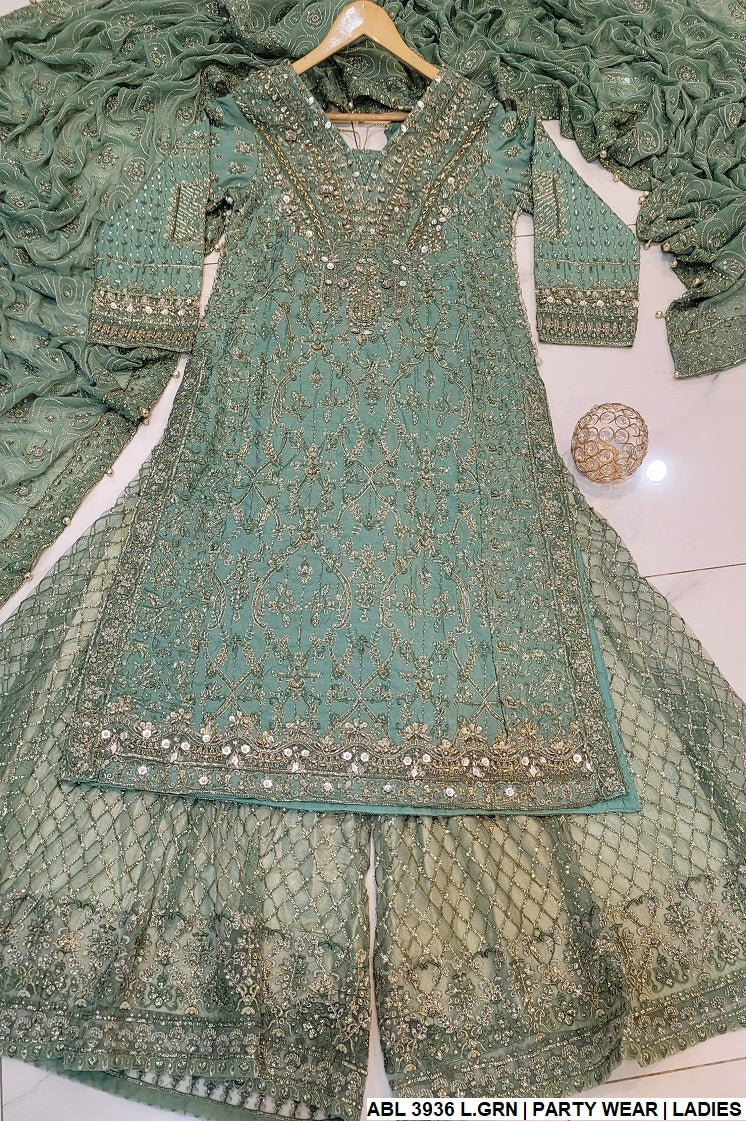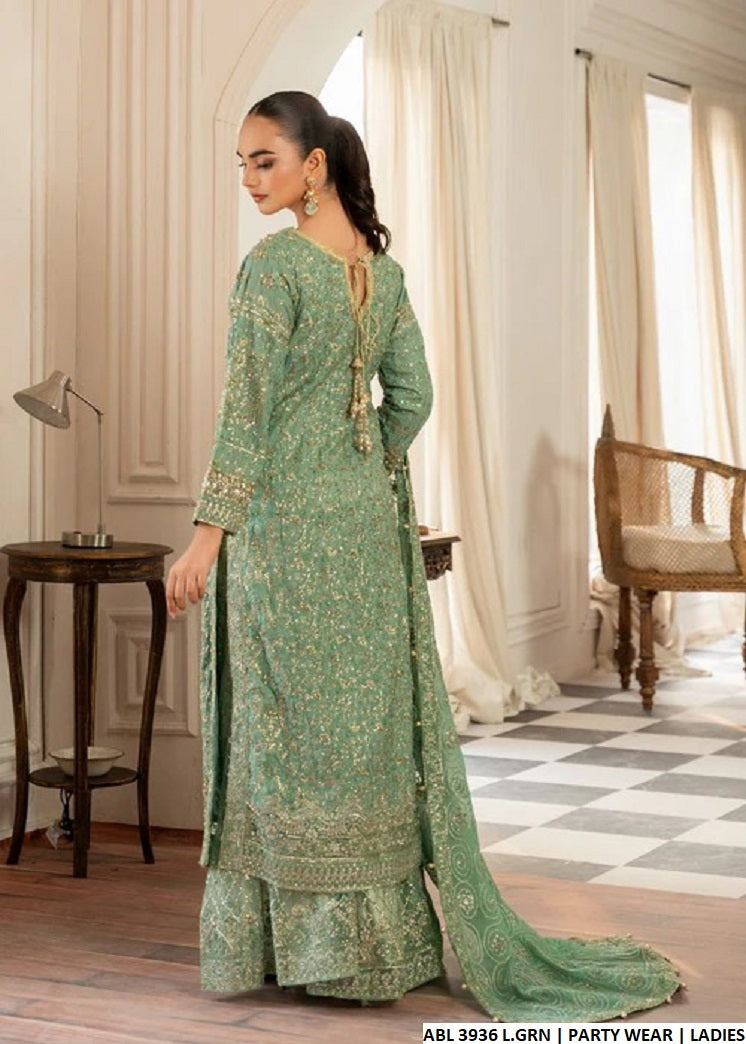 This stunning outfit features a grip fabric shirt, offering a smooth and elegant drape, paired with net fabric trousers, adding a touch of sophistication. Designed in an A-line silhouette with a plazo, the shirt has a graceful length ranging from 45 to 47 inches, creating a flowy and flattering look. The ensemble is completed with a chiffon dupatta, enhancing its elegance and charm. Weighing 1.700 kg, this outfit is a perfect choice for formal and festive occasions, combining luxury with comfort.
