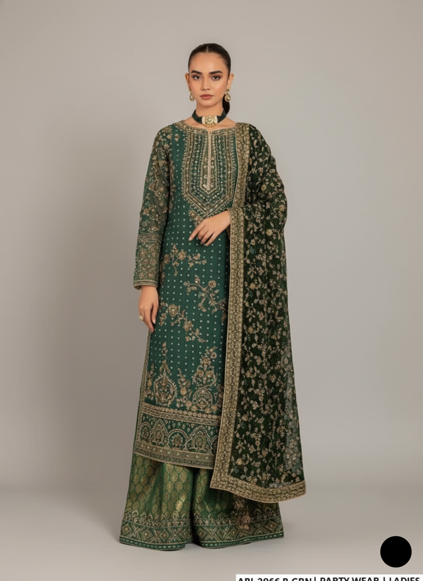 - This elegant ensemble features a chiffon shirt paired with a jamwar trouser, offering a unique combination of lightness and intricate texture. The chiffon dupatta complements the outfit with its soft and flowing nature. The shirt's 46 to 48-inch length provides a flattering silhouette, while the ghrara adds a traditional flair with its voluminous, graceful appearance. Weighing 1.500 kg, this ensemble exudes sophistication, making it perfect for festive occasions or cultural events where both comfort and style are key