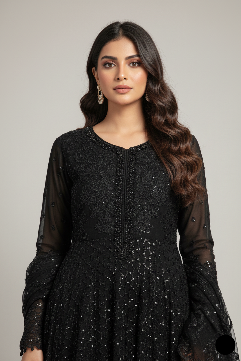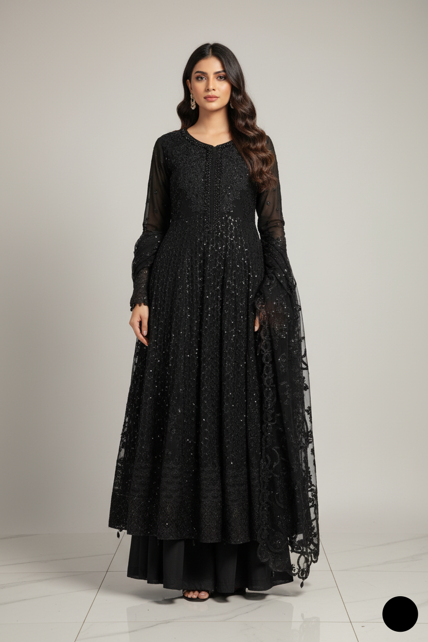 This elegant long frock with plazo set is made from chiffon, offering both comfort and sophistication. The viscose trousers provide a smooth, relaxed fit, complementing the flowy frock style. The matching chiffon dupatta adds a light, airy layer to the outfit, enhancing its grace. With a shirt length of 50 to 52 inches, it offers a flattering and comfortable fit for various occasions. Weighing just 1.450 kg, this ensemble is ideal for formal and semi-formal events, offering both elegance and ease of wear.