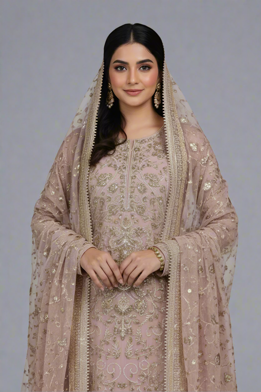 This elegant ensemble features a beautifully designed shirt with gharara, crafted entirely from premium chiffon fabric. The shirt, trouser, and dupatta are all made of lightweight chiffon, offering a graceful and breathable fit perfect for formal and semi-formal occasions. The shirt length ranges between 39 to 41 inches, providing a modest yet stylish silhouette. With a total outfit weight of 1.550 kg, this outfit strikes a balance between luxury and comfort.