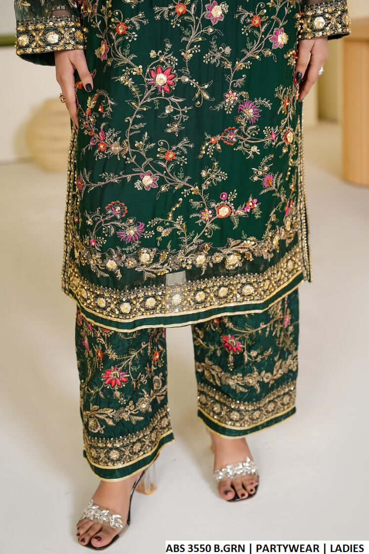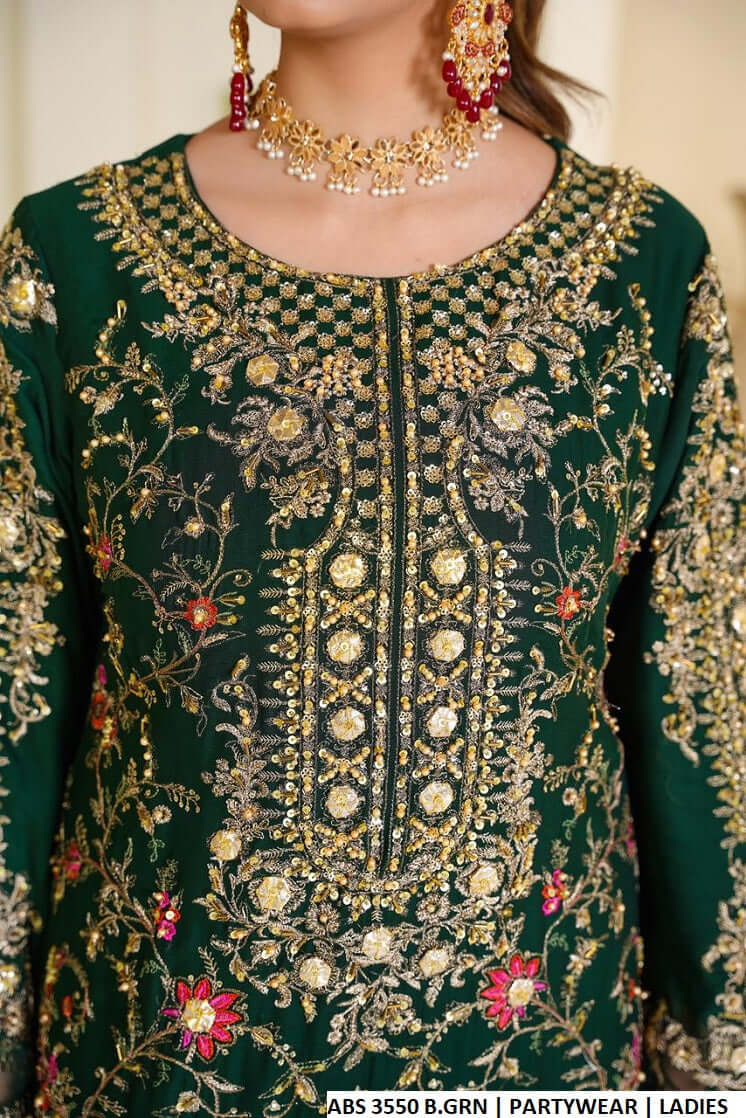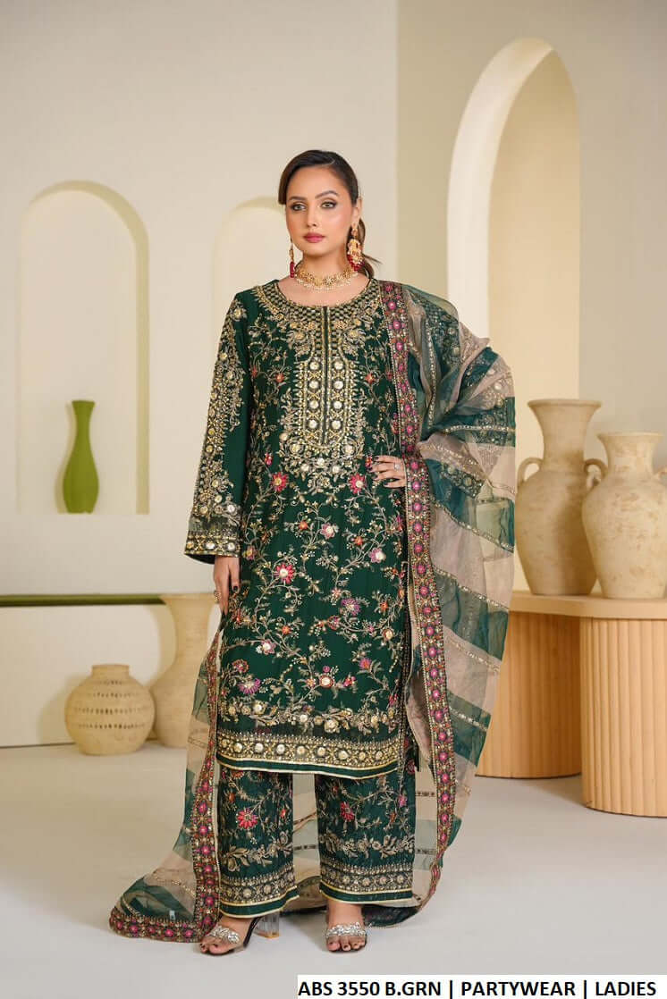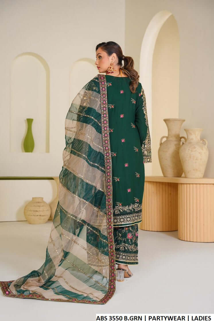 This beautifully crafted outfit features a Straight Shirt style made from luxurious Chiffon fabric, paired with comfortable and soft Viscose trousers. The look is completed with an elegant Organza Dupatta, adding a touch of sophistication to the ensemble. With a shirt length of 42 to 44 inches and a total weight of 1.050 KG, this 3-piece set is ideal for formal events, festive occasions, or classy evening wear.