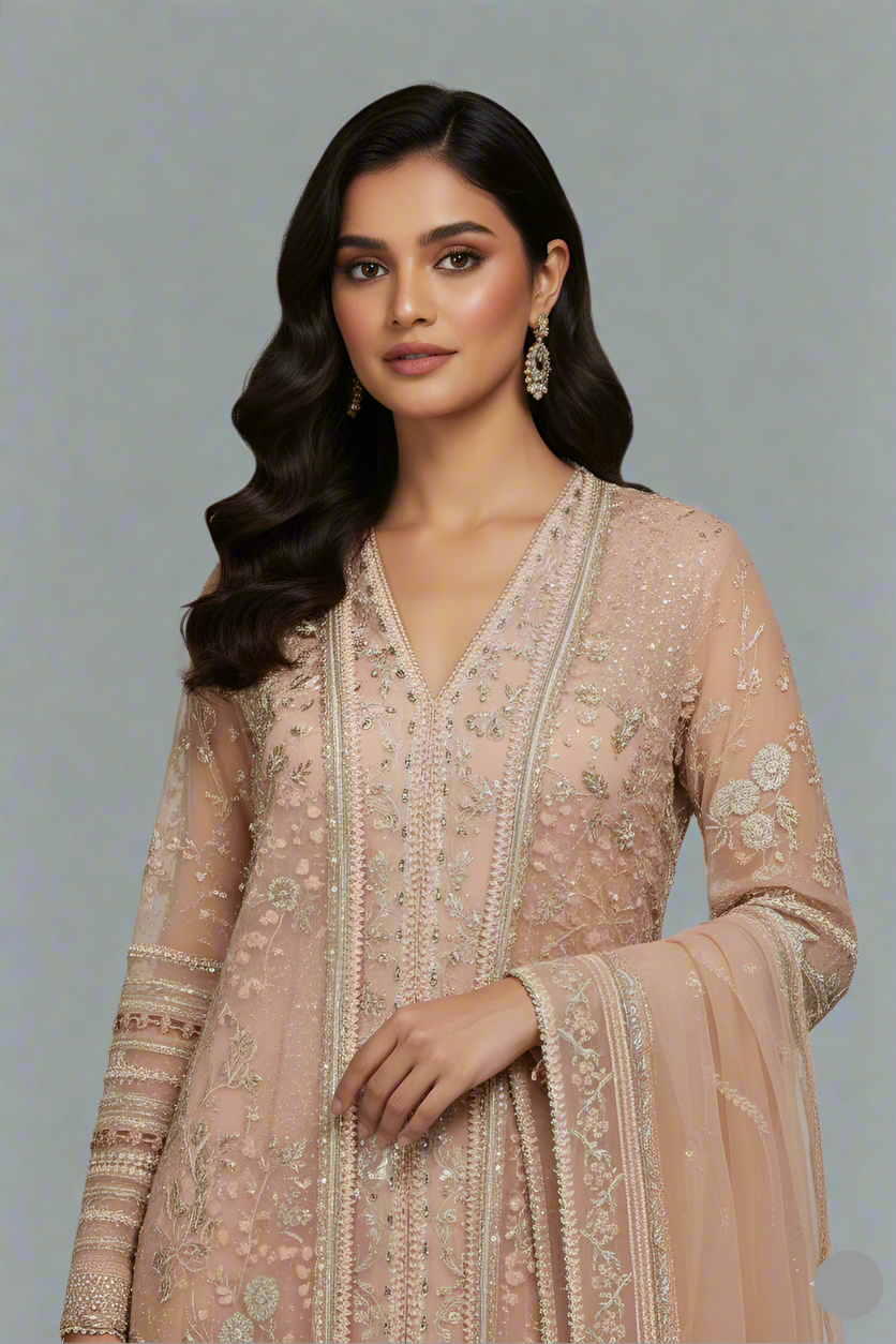 This stunning ensemble features an elegant open A-line shirt crafted from premium organza, paired with a sleek grip trouser and a matching organza dupatta. The shirt, with its flowing silhouette, measures between 54 to 56 inches in length, offering a graceful and dramatic flair perfect for formal occasions. With a total weight of 1.150 kg, this 3-piece outfit maintains a luxurious yet wearable feel. The organza fabric enhances the outfit's regal appeal, while the grip trousers provide a comfortable and polished finish to the look.