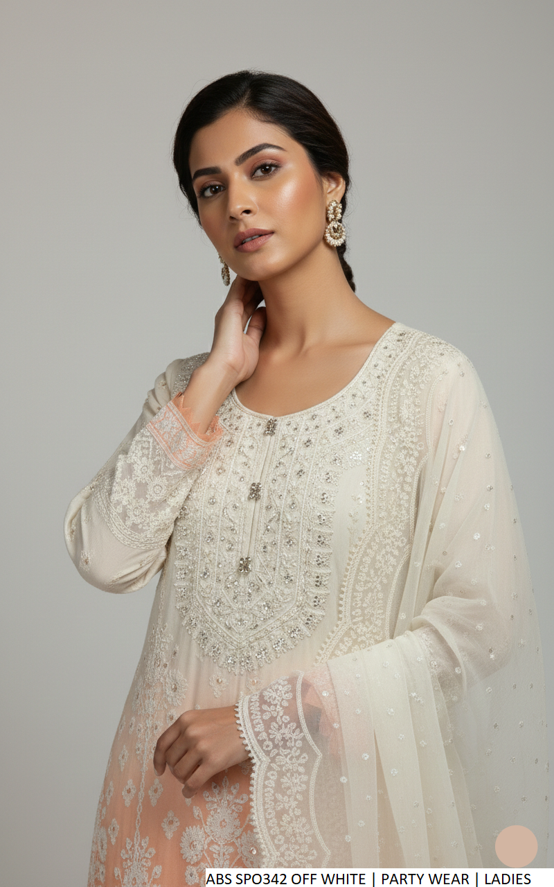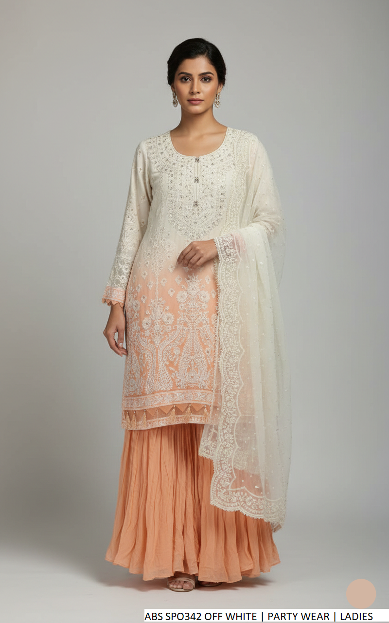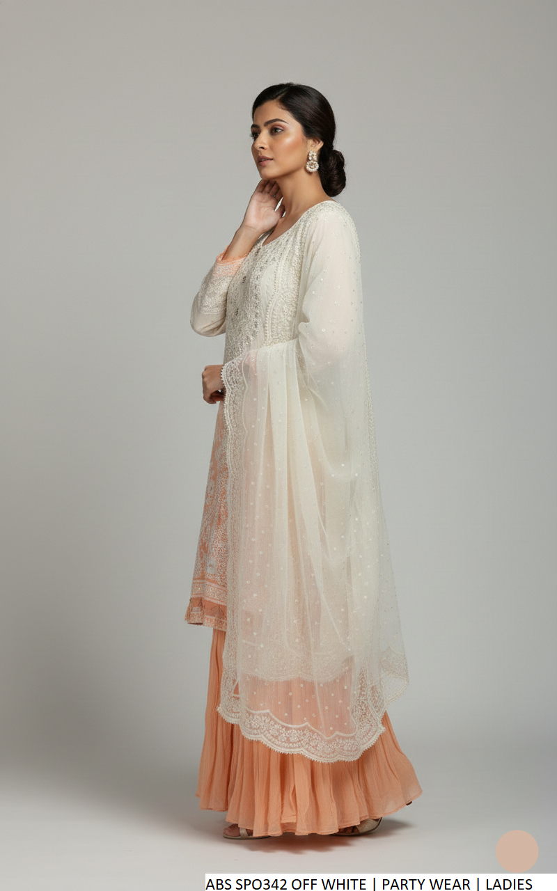 This elegant outfit is crafted from premium chiffon fabric, including the shirt, trousers, and dupatta, offering a lightweight and graceful drape. Designed in a classic shirt with garara style, it provides a timeless and sophisticated look. The shirt length ranges between 40 to 42 inches, ensuring a flattering fit, while the total outfit weight is approximately 1.00 kg, making it comfortable for extended wear.