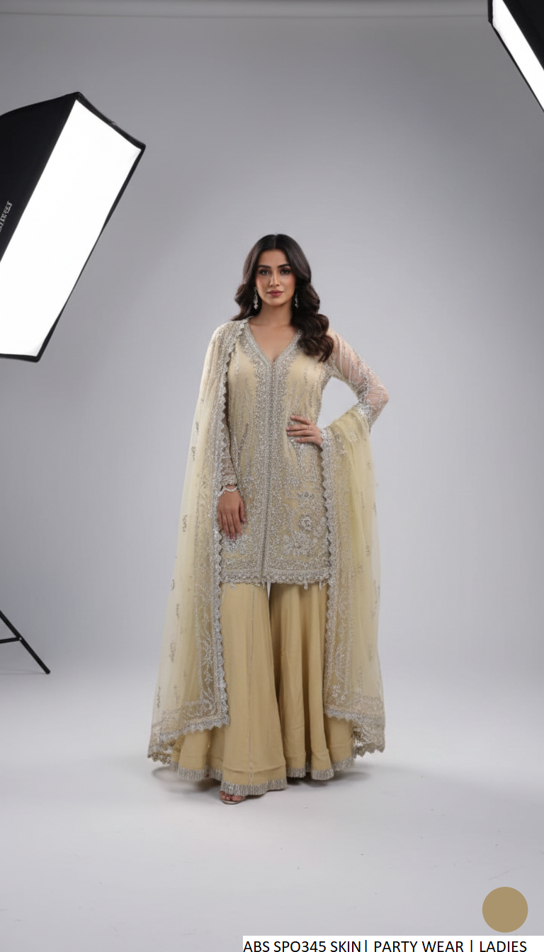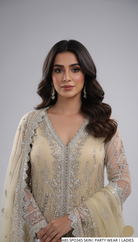 This elegant outfit features a shirt crafted from premium organza fabric, paired with grip fabric trousers for comfort and structure. The dupatta is also made from organza, adding a graceful and airy touch to the ensemble. Designed in an open shirt gown style with plazo trousers, the shirt length ranges between 36 to 38 inches. The complete outfit has an approximate weight of 1.150 kg, making it suitable for formal and festive wear.