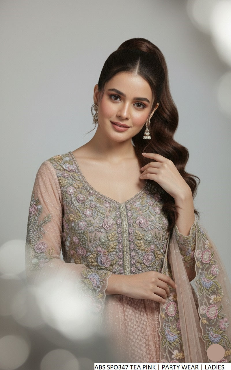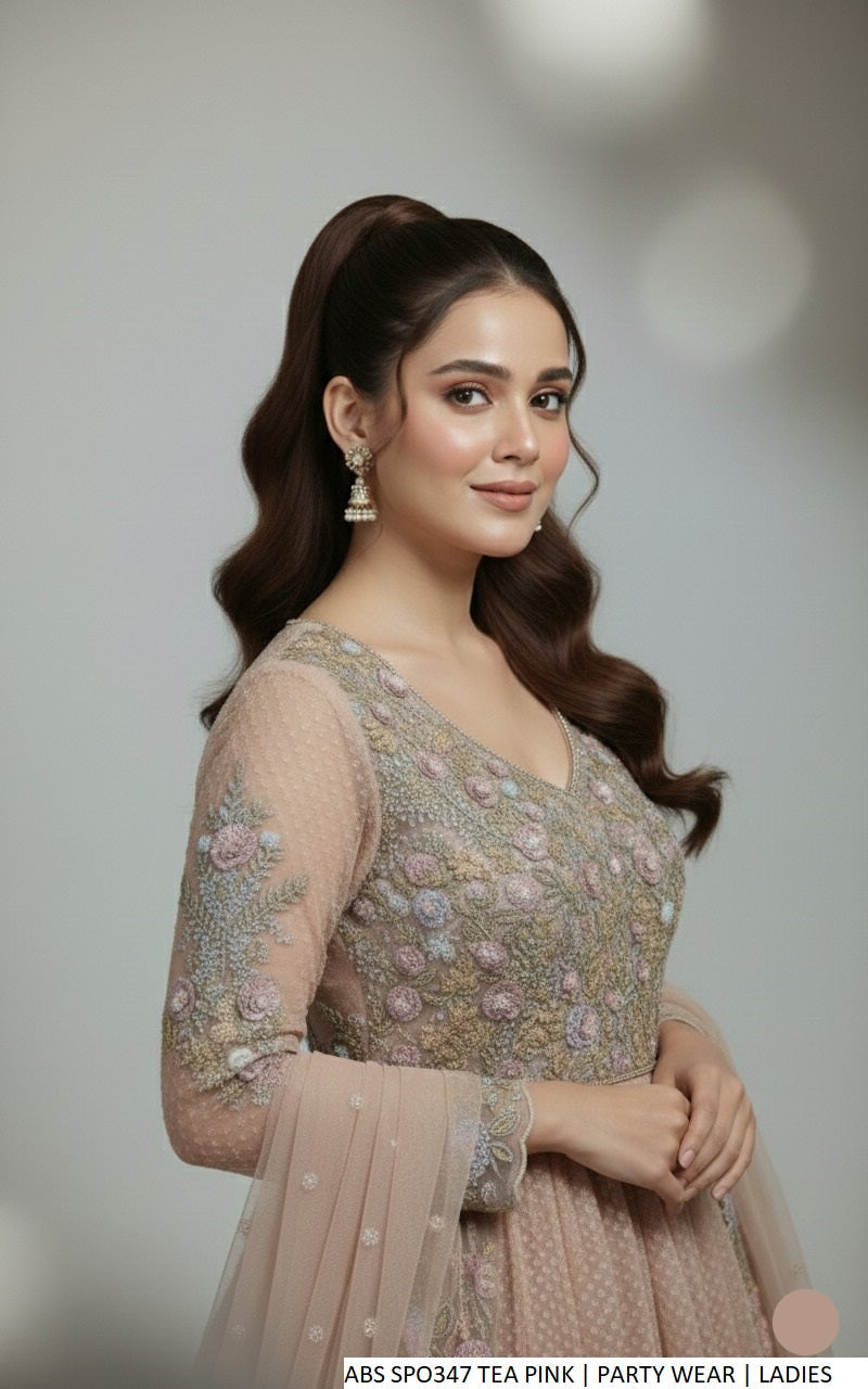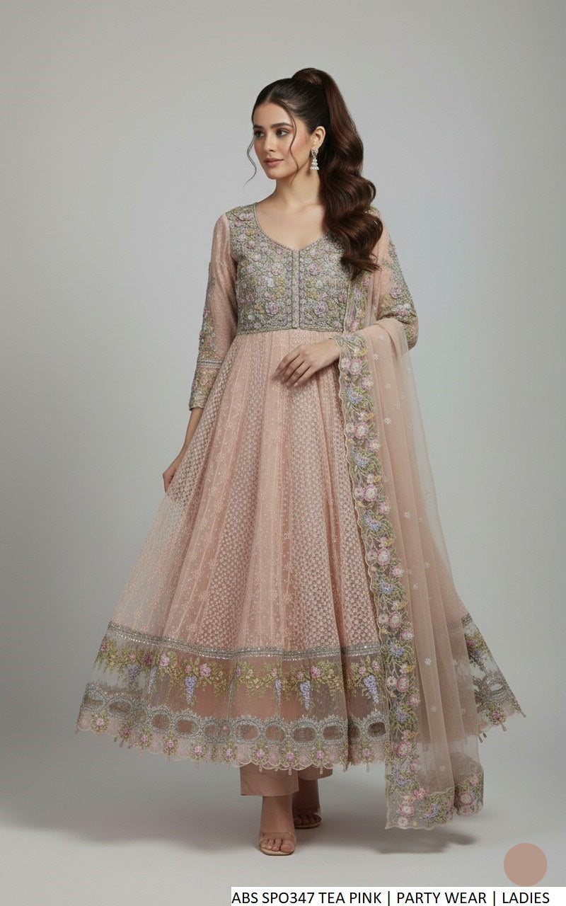 This elegant ensemble features a beautifully crafted organza shirt paired with comfortable grip fabric plazo trousers. The look is completed with a lightweight chiffon dupatta that adds a soft, flowing finish. Designed in a long frock style with plazo, the shirt length ranges from 47 to 49 inches. With an approximate weight of 1.450 kg, this outfit is ideal for formal, festive, and special occasions.