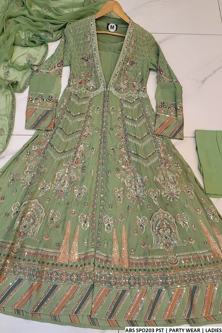 1. This exquisite ensemble features an open gown frock made from premium chiffon fabric, exuding elegance and sophistication. With a length of 58 to 60 inches, the frock offers a stunning flow and graceful silhouette, perfect for formal occasions. Paired with grip fabric trousers, the outfit ensures both style and comfort. The chiffon dupatta adds a touch of delicacy and refinement, completing the look. Weighing 1.150 kg, this luxurious attire is an ideal choice for making a statement at any special event or celebration.