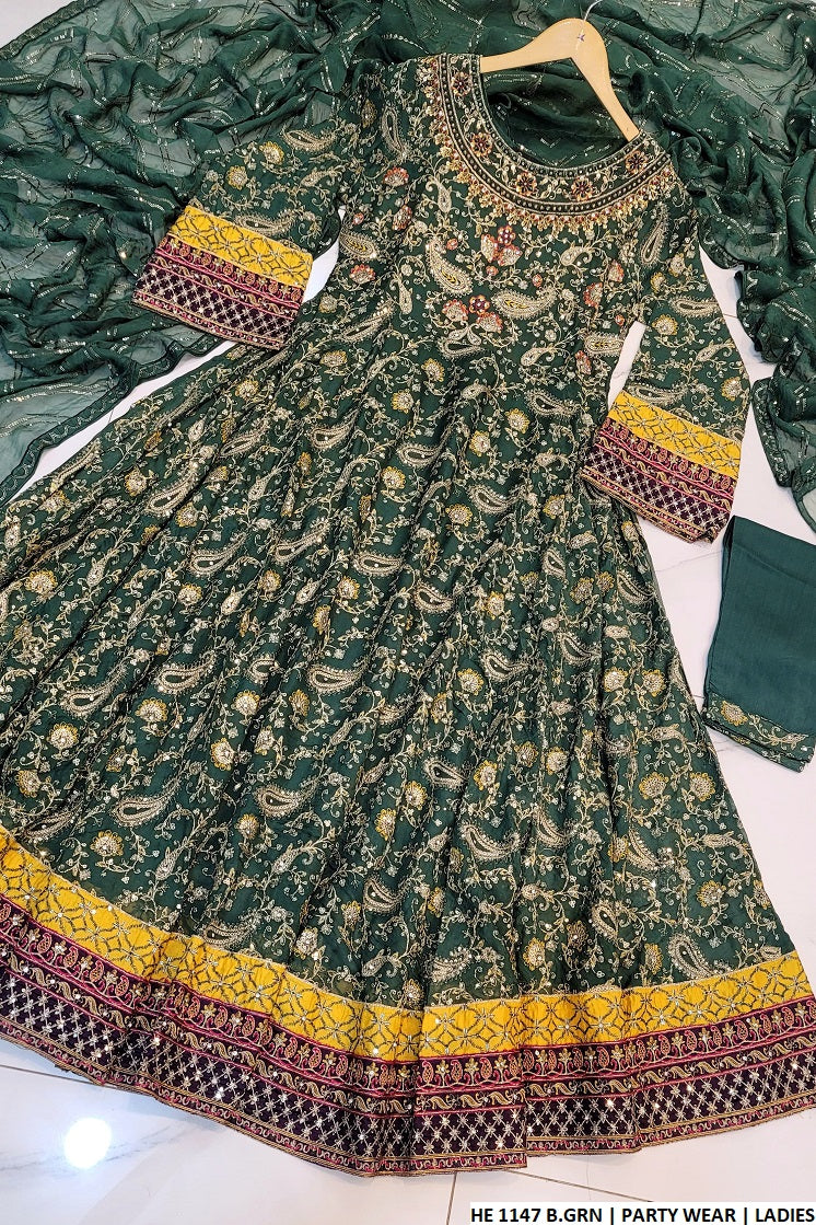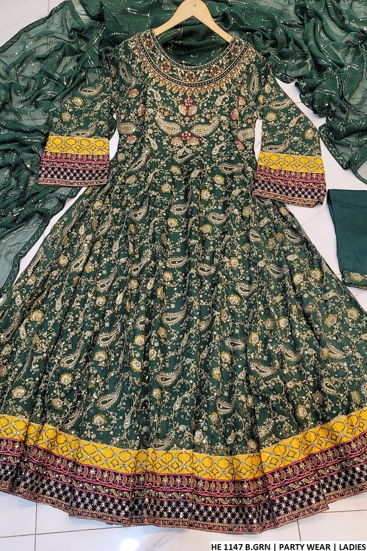- This stunning outfit features a shirt made from delicate chiffon fabric, paired with a viscose trouser and a matching chiffon dupatta. The style showcases a full flare long frock, offering an elegant and flowing silhouette. With a shirt length of 54 to 56 inches and weighing approximately 1.200 kg, this ensemble provides both comfort and a graceful, flattering fit for any occasion.