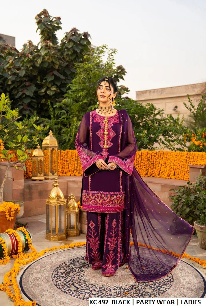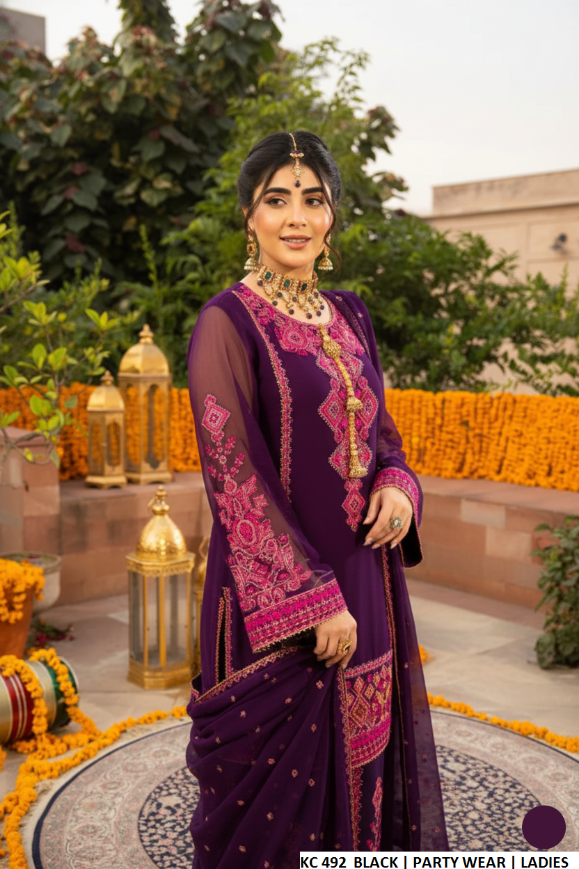 This elegant 3-piece outfit features a stylish short shirt crafted from premium georgette chiffon, paired with a comfortable grip plazo that ensures a graceful drape and ease of movement. The look is completed with a matching georgette chiffon dupatta, adding a soft and luxurious touch. Designed in a short shirt with plazo style, this outfit offers a modern yet traditional appeal with a shirt length of 34/36 inches. With an approximate weight of 1.0 kg, it is ideal for festive gatherings, formal occasions, and special events.