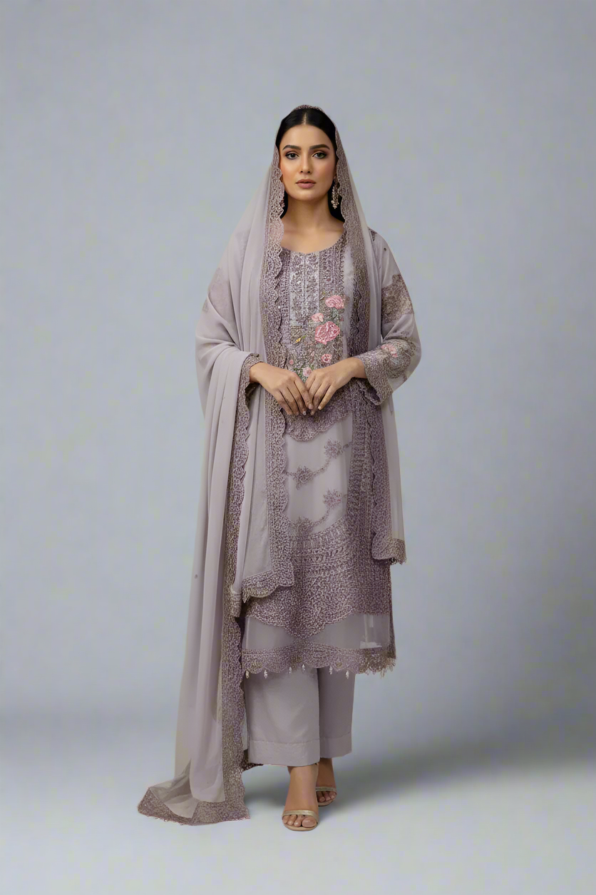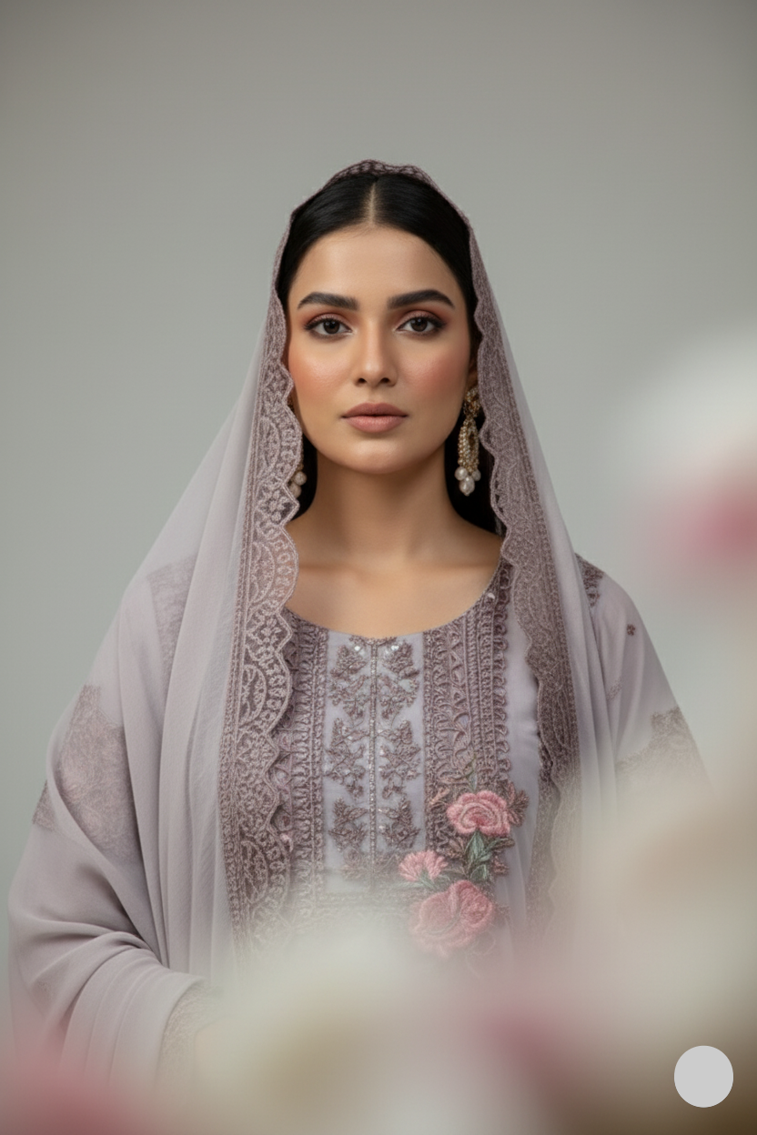 This stylish ensemble features a chiffon shirt paired with a comfortable grip plazo, giving it a modern yet elegant look. The chiffon dupatta adds a light and breezy touch to the overall design. With shirt lengths of 43 and 45 inches and a total outfit weight of 0.750 KG, this 3-piece suit is perfect for casual to semi-formal events, offering both style and ease of wear.