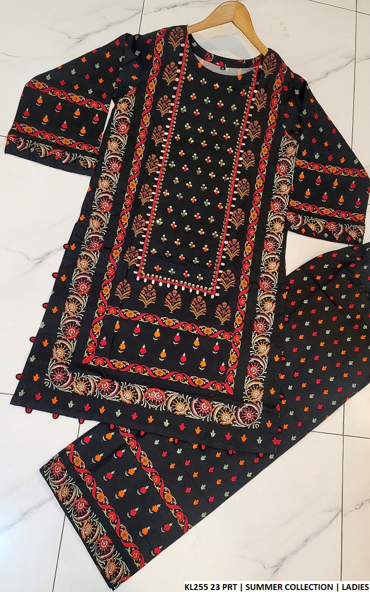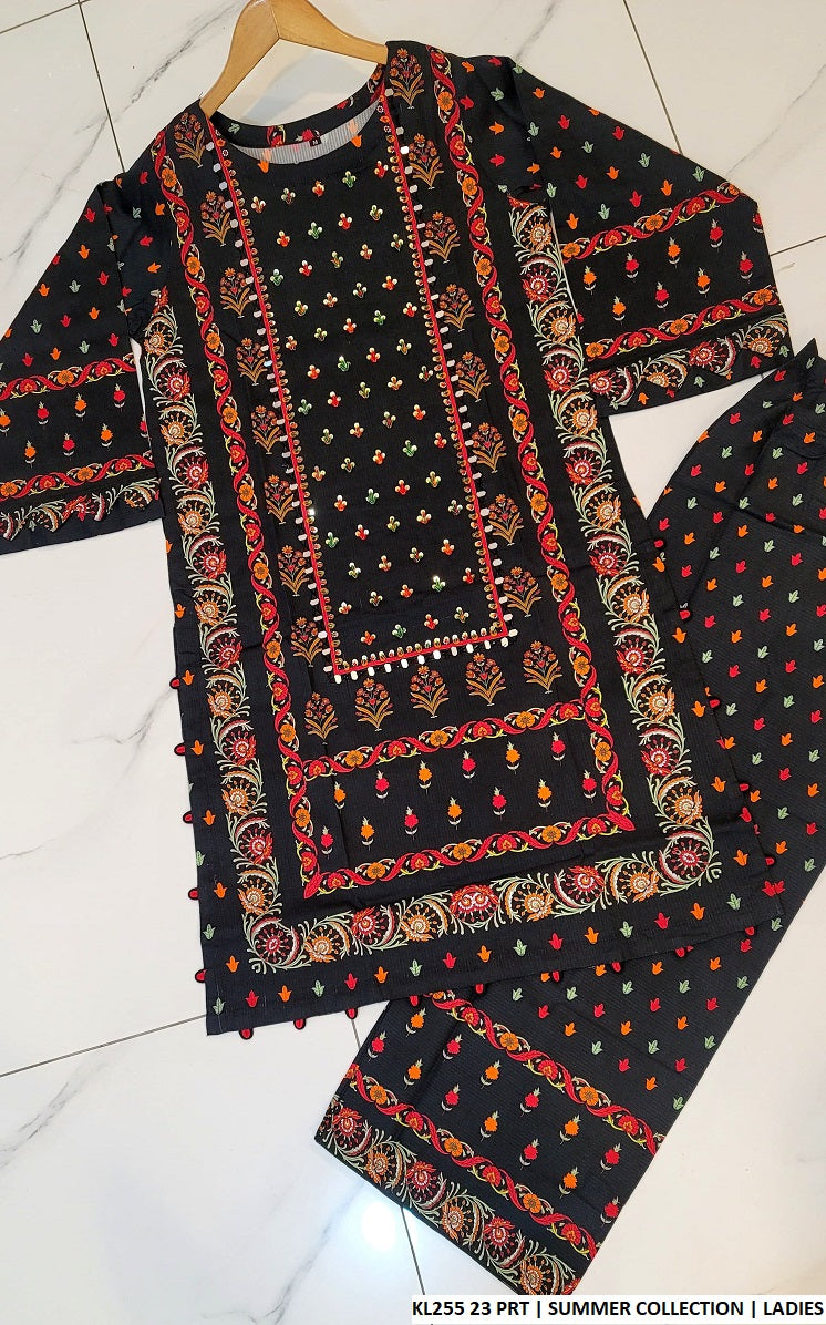 This elegant outfit features a cotton shirt with a length of 38/40 inches, paired with matching cotton plazo and a two-piece dupatta. Weighing 0.450 kg, it is lightweight, stylish, and comfortable.