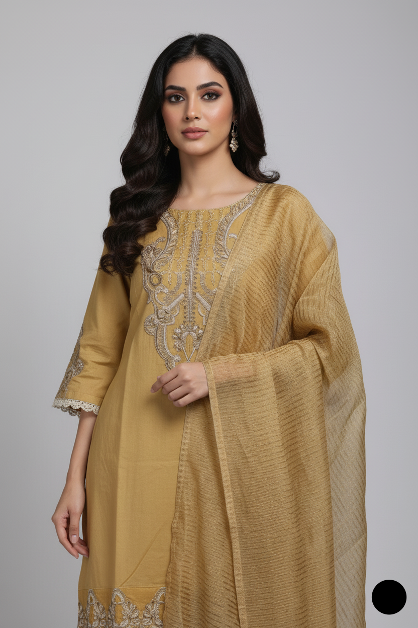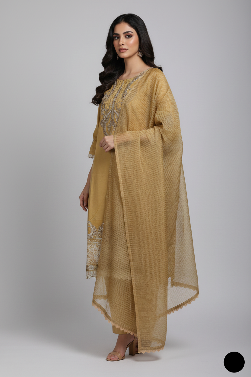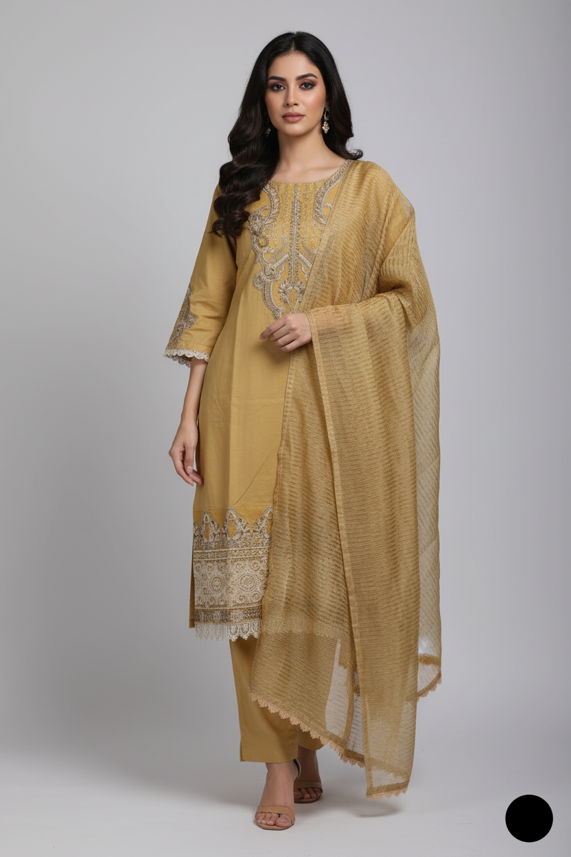 This beautifully designed 3-piece outfit features a straight-cut shirt made from breathable and durable cotton, paired with matching cotton trousers for all-day comfort. The ensemble is elevated with a luxurious Masuri dupatta, adding a subtle shimmer and grace to the overall look. With a shirt length between 41 and 43 inches, this suit offers a flattering, modest fit. Weighing only 0.550 kg, it’s perfect for everyday wear or casual gatherings.