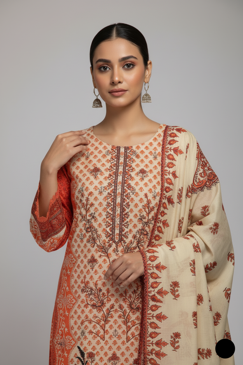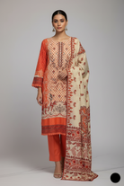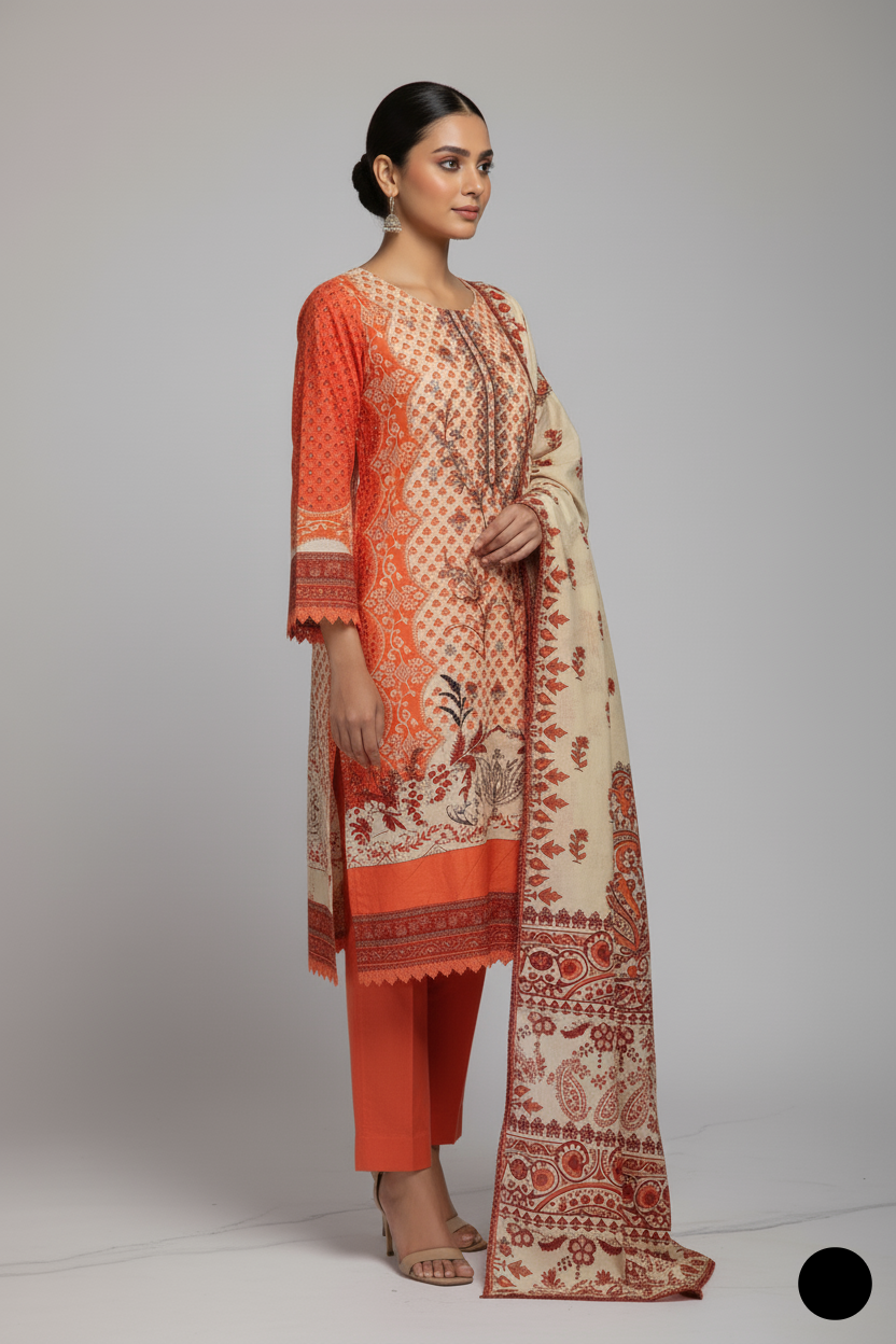 This outfit is crafted from lawn fabric for both the shirt and trouser, ensuring a lightweight and breathable feel, ideal for warm weather. The A-line shirt design, with a length ranging from 42 to 44 inches, offers a graceful and flattering silhouette. Complementing the ensemble is a lawn dupatta, adding a cohesive and elegant touch to the outfit. With a total weight of 0.450 kg, this suit is comfortable and easy to wear, making it a perfect choice for both casual and semi-formal occasions.
