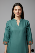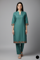 This chic and comfortable ensemble features a straight shirt made from soft, breathable cotton fabric, designed for everyday elegance. It comes paired with a classic farshi shalwar, also in cotton, offering a traditional yet stylish touch. The outfit is completed with a two-piece dupatta that adds both coverage and flair. The shirt length measures between 33 and 35 inches, ideal for a neat and modern silhouette. Weighing just 0.350 kg, this lightweight set is perfect for summer wear or casual daily use.