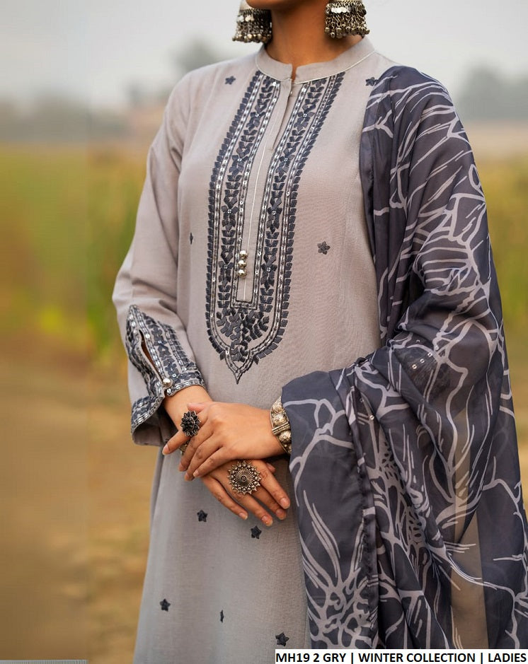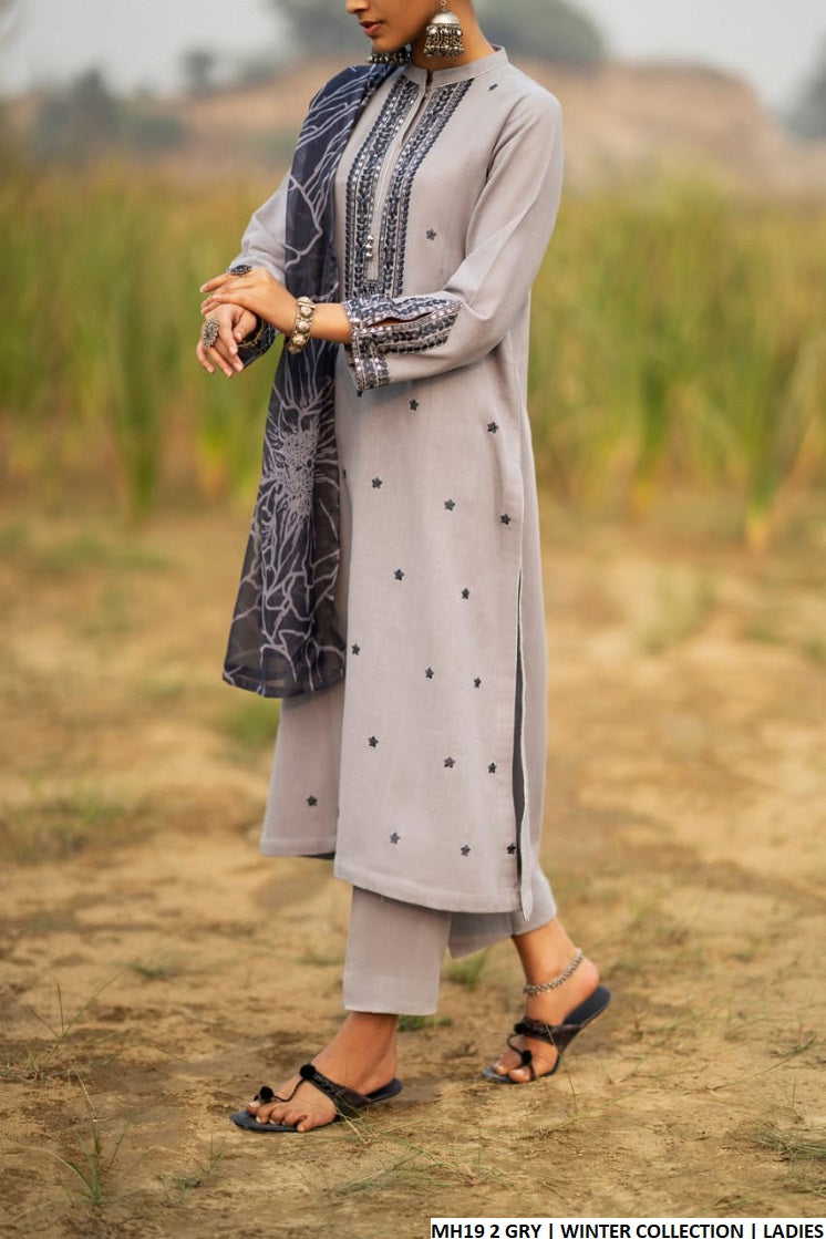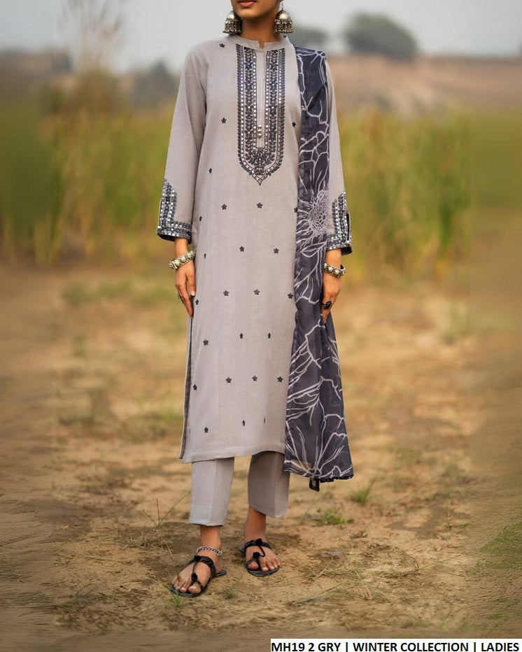 - This elegant outfit is made from high-quality Sulb Khaddar fabric for both the shirt and trouser, offering a comfortable and durable wear. The shirt is designed in a straight-cut style, with a length of 43/45 inches, ensuring a flattering fit. The matching Sulb Khaddar trousers complete the look with a cohesive and polished appearance. To add a touch of sophistication, the dupatta is made from a digitally printed fabric, enhancing the overall aesthetic. With a weight of 0.650 kg, this set is both lightweight and stylish, perfect for everyday wear or special occasions.