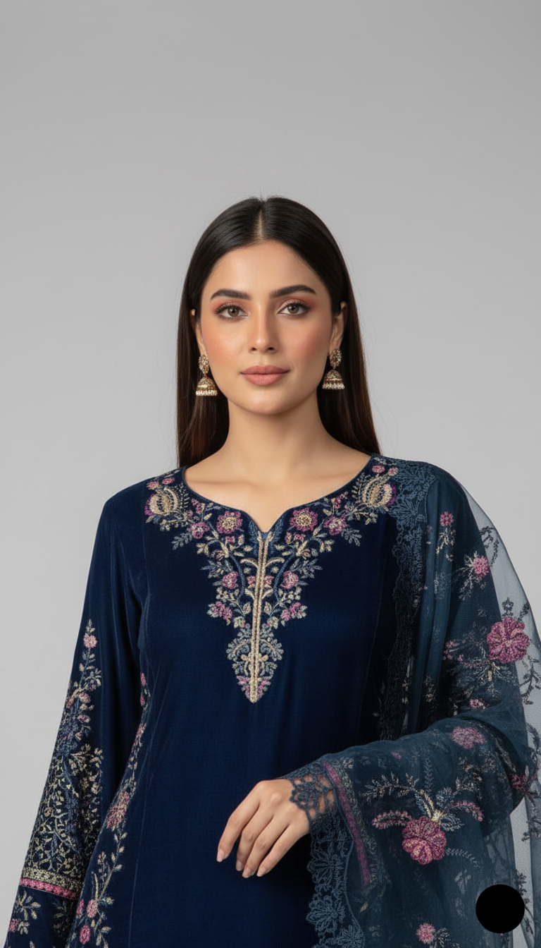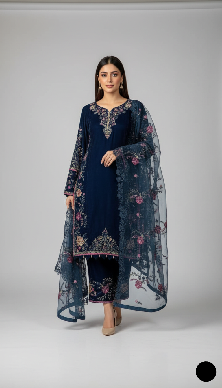This elegant ensemble features a luxurious velvet shirt paired with matching velvet palazzo trousers, offering both style and comfort. The outfit is beautifully complemented by a delicate organza dupatta, adding a touch of grace and sophistication. Designed in a stylish shirt with palazzo style, this set is perfect for formal occasions or festive gatherings. The shirt length is 40/42 inches, and the total weight of the outfit is 0.900 kg, making it a lightweight yet rich-feeling choice for any wardrobe.
