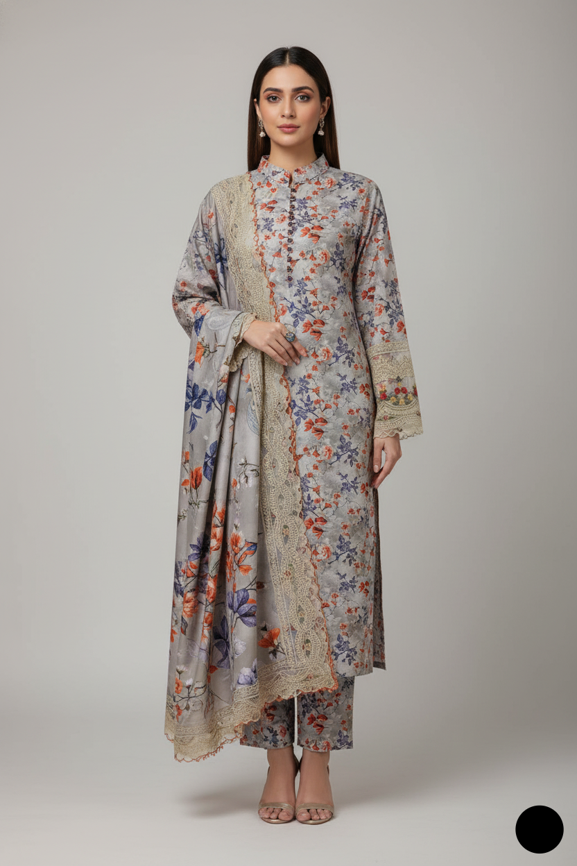 1. This elegant outfit is crafted from Sulb Khaddar fabric for both the shirt and trousers, offering a durable yet comfortable feel. The dupatta is made from a digital Khaddar shawl fabric, combining traditional texture with a modern print. The shirt is designed in a straight cut style, with a length of 41/43, providing a classic and flattering silhouette. Weighing 0.850 kg, this ensemble strikes the perfect balance between comfort and style, making it a versatile and chic choice for any occasion.