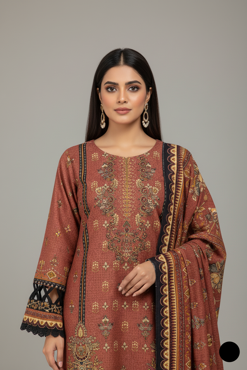 1. This sophisticated outfit is made from high-quality khaddar fabric, featuring a stylish A-line shirt that offers a comfortable and flattering fit. The shirt has a length of 39 to 41 inches, providing a graceful and elegant silhouette. It is paired with matching khaddar trousers, creating a coordinated and polished look. The ensemble is completed with a khaddar dupatta, adding a refined touch to the overall outfit. Weighing 0.850 kg, this set is perfect for cooler weather, providing both warmth and style for a variety of occasions.
