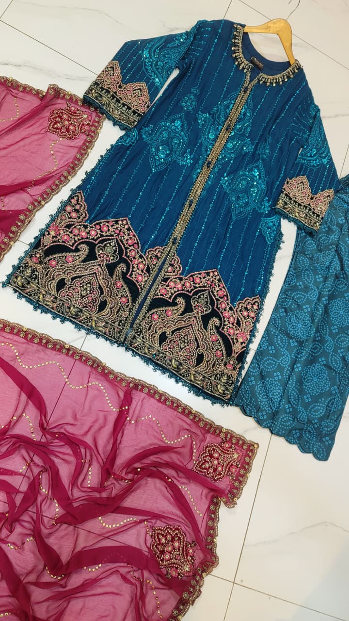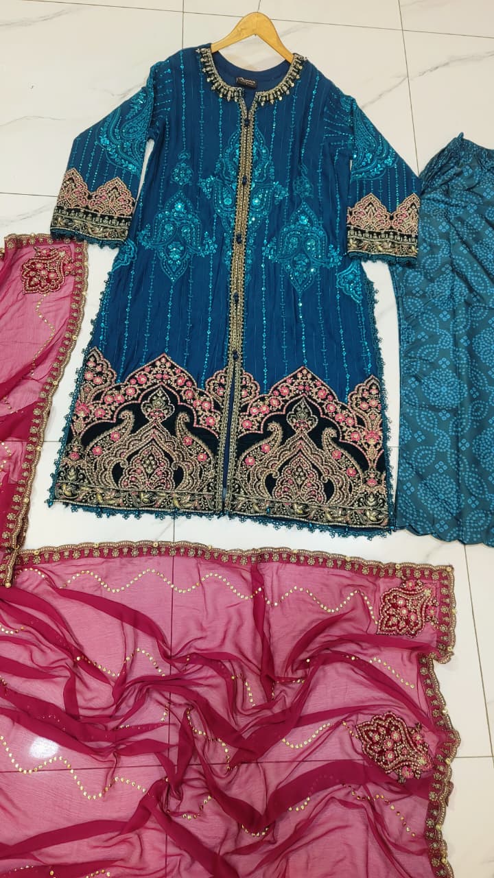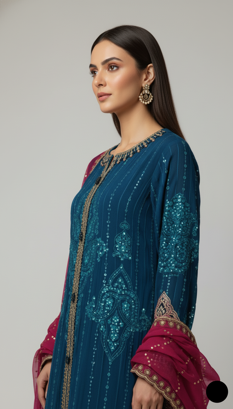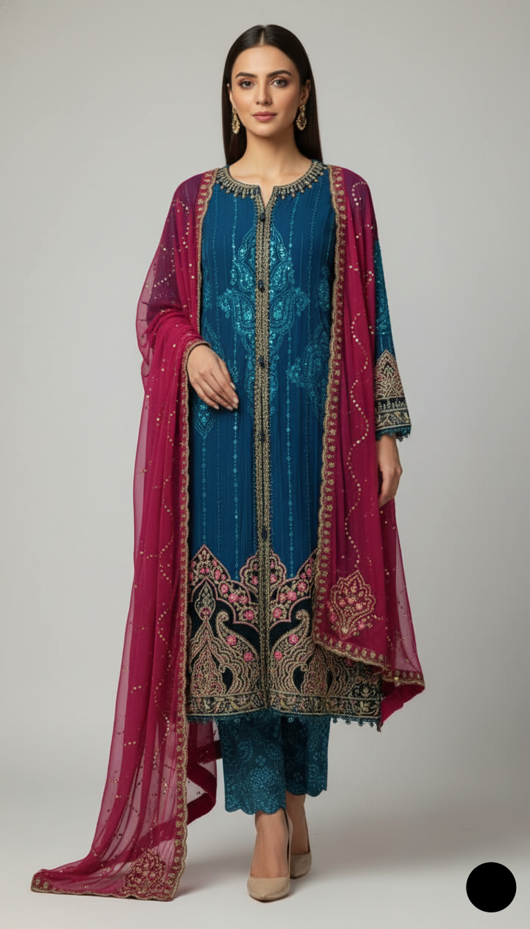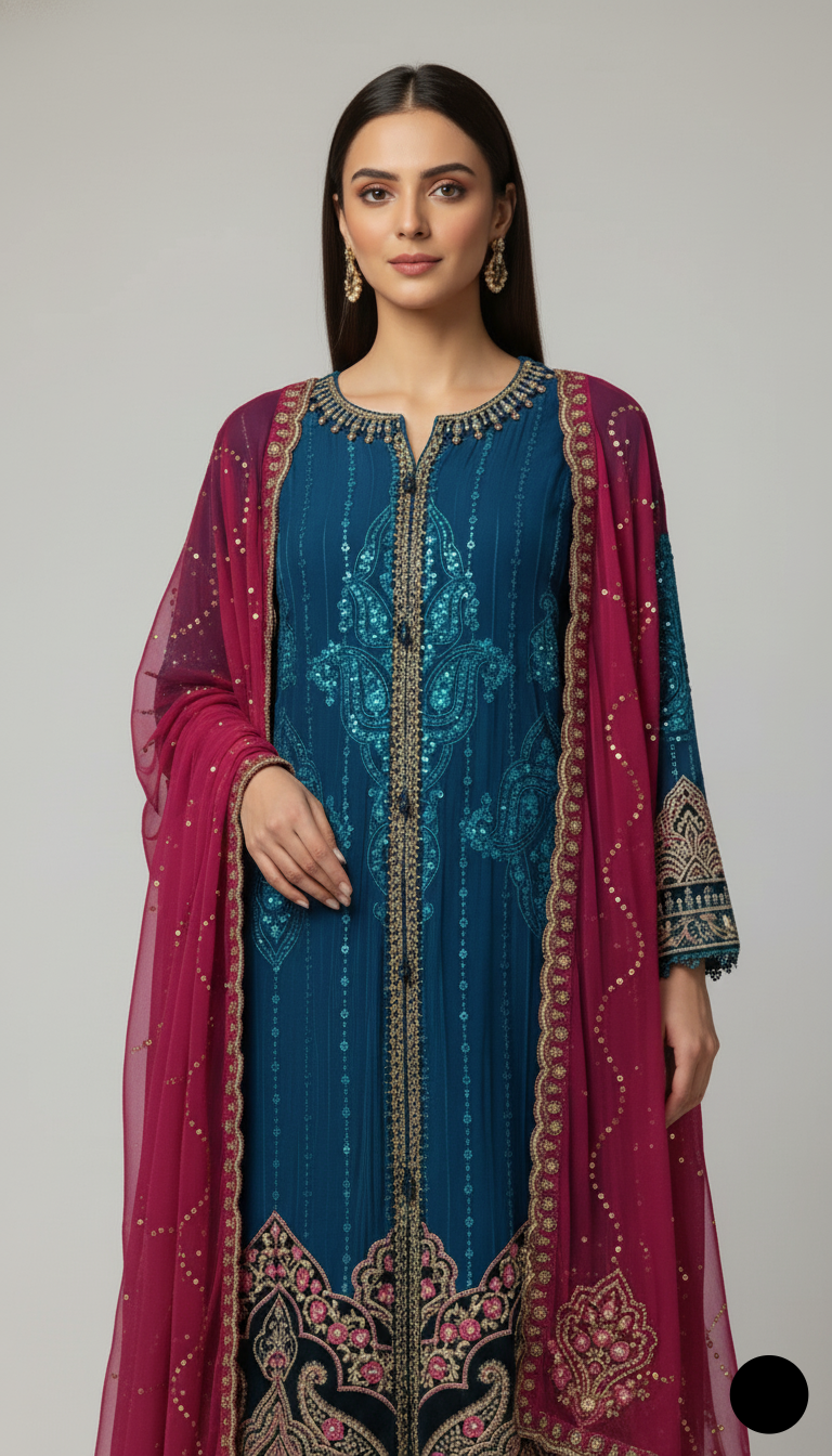 This elegant ensemble features a graceful open A-line shirt crafted from premium chiffon, offering a flowy and sophisticated silhouette. The shirt is paired with a comfortable grip fabric trouser, ensuring a flattering fit. Completing the look is a matching chiffon dupatta that adds an extra touch of elegance. With a shirt length of 45 to 47 inches and a lightweight design of only 1.050 kg, this outfit is perfect for formal gatherings and festive occasions.
