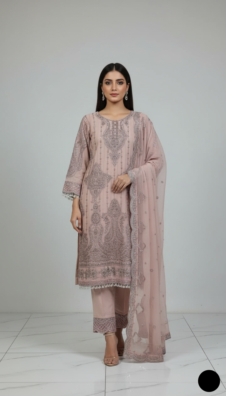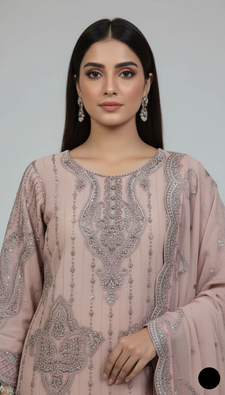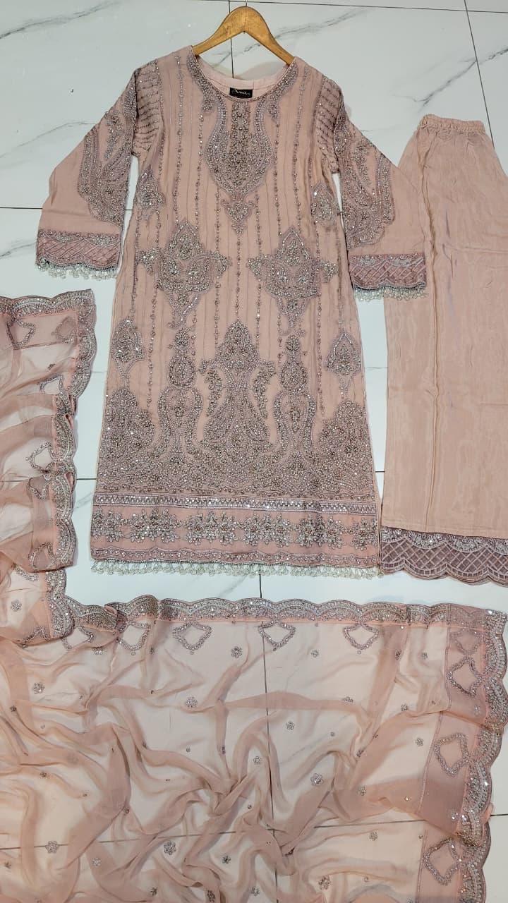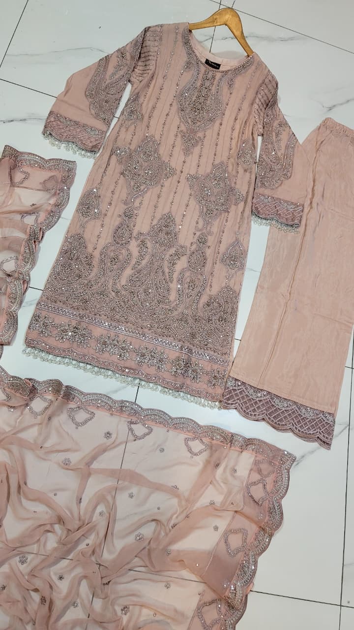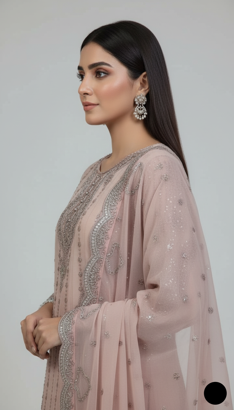 This stylish ensemble features a beautifully tailored chiffon shirt paired with a flowing plazo, offering both comfort and elegance. The grip fabric trousers provide a flattering, structured fit, while the chiffon dupatta adds a graceful finishing touch. With a shirt length of 43 to 45 inches and a total weight of just 1.000 kg, this outfit is ideal for semi-formal events, festive gatherings, or evening functions.
