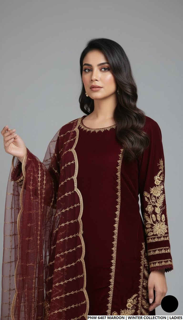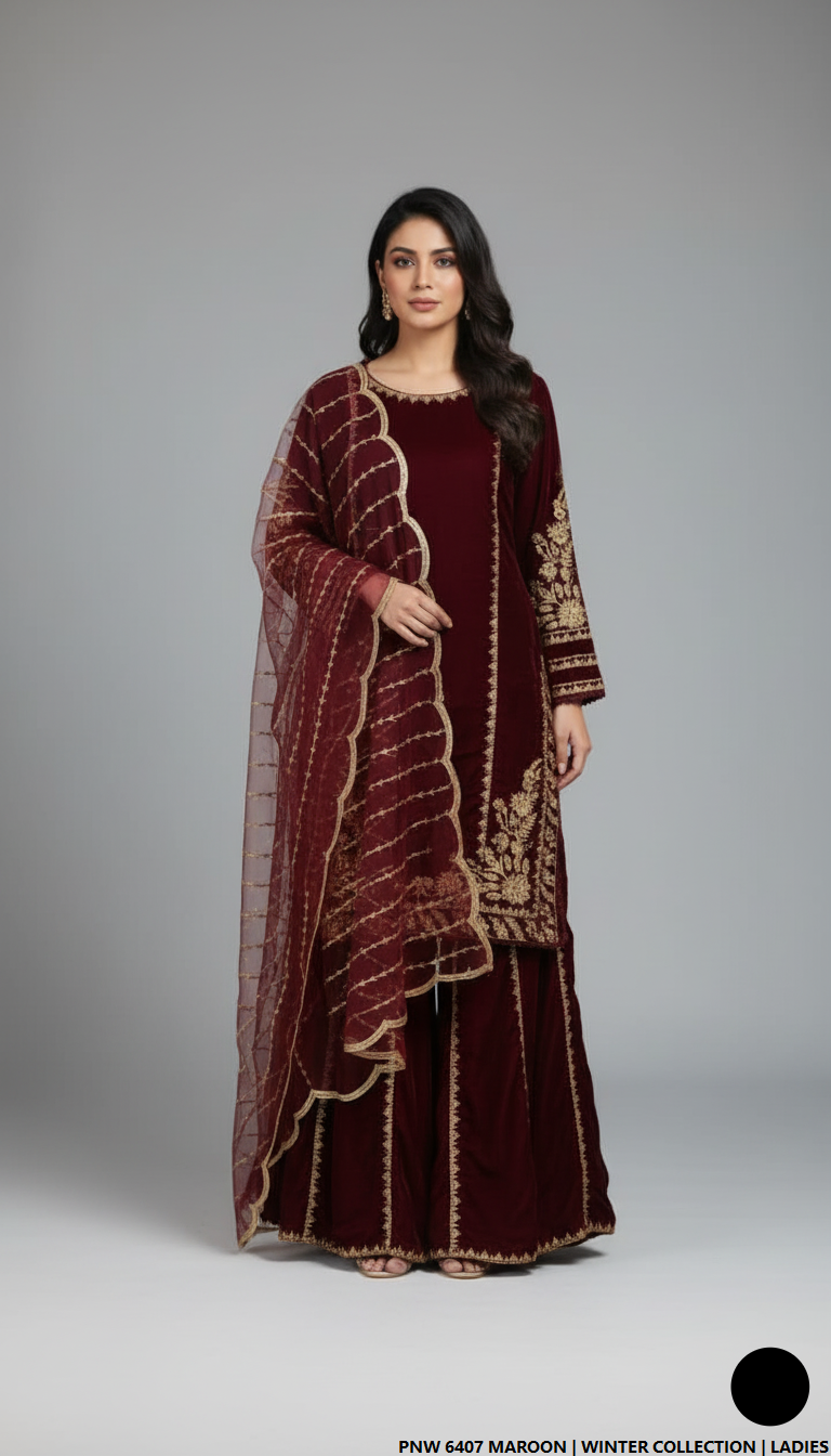 This stunning outfit features a rich velvet shirt paired with a beautifully tailored velvet gharara, creating a timeless and graceful silhouette. The set is enhanced with a lightweight, flowing organza dupatta, adding a touch of elegance and charm. Designed in a traditional shirt with gharara style, the shirt length is 36/38 inches, and the total weight of the outfit is 0.900 kg, offering both luxury and comfort — perfect for weddings, festive occasions, or formal events.