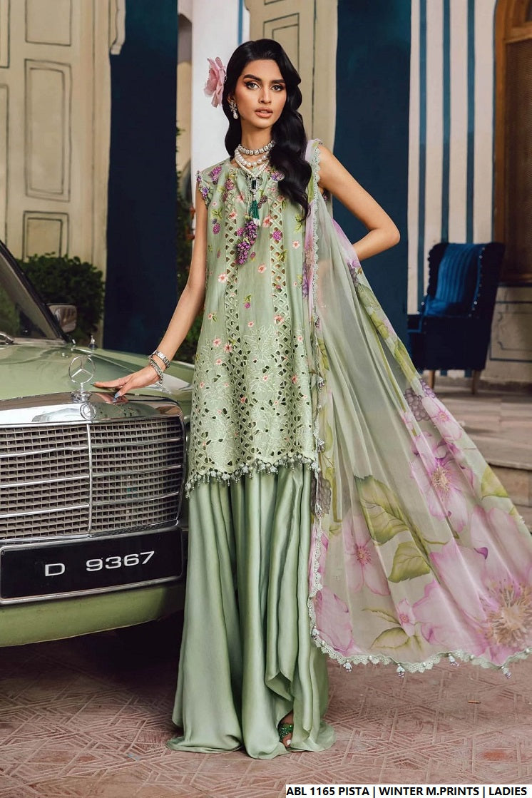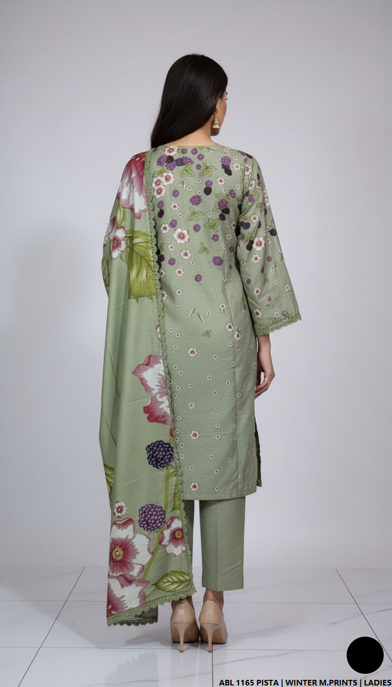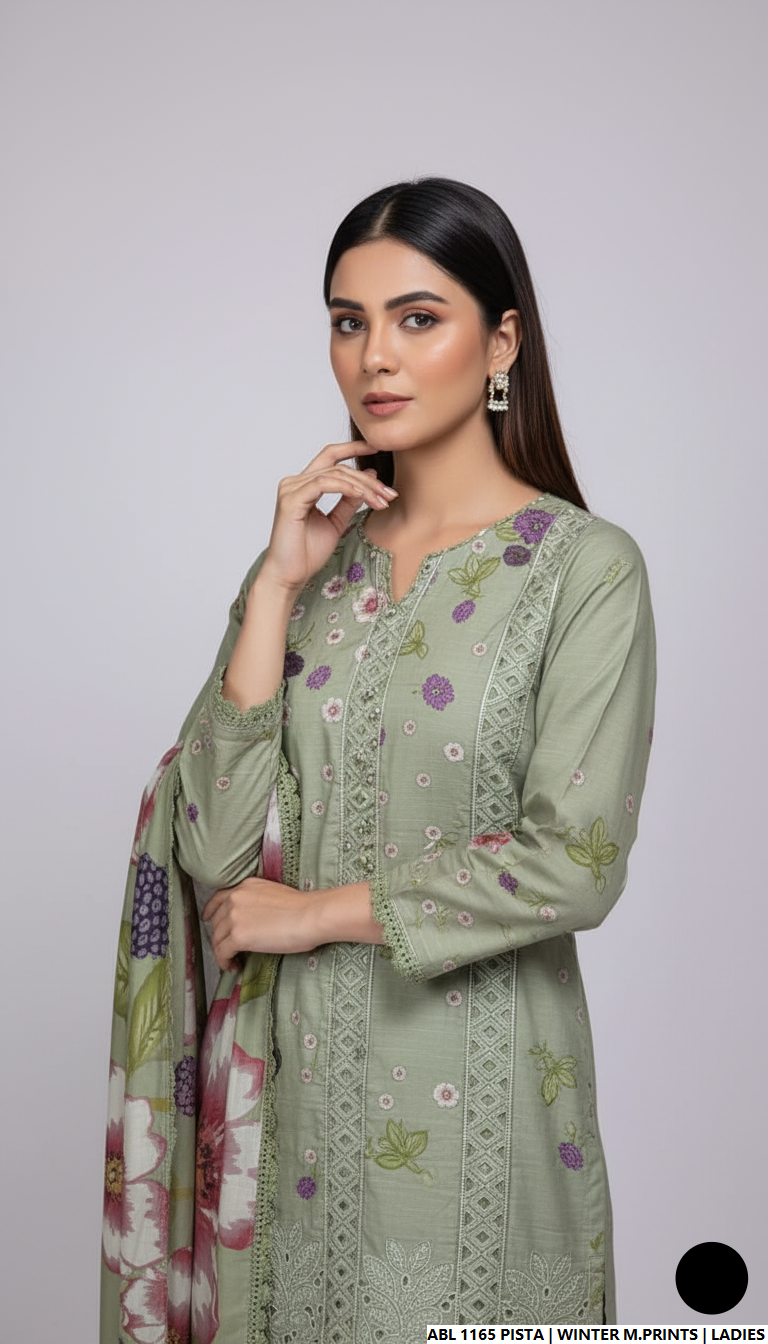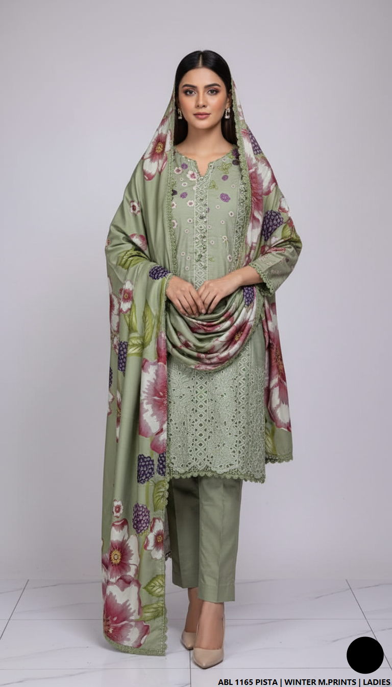 This elegant Khaddar 3-piece outfit combines modern style with winter comfort. Featuring a Khaddar shirt paired with a trendy plazo, it creates a chic and flattering silhouette. The wool shawl dupatta adds warmth and sophistication, perfect for colder days. With a shirt length of 40/42 inches and a total weight of 0.900 kg, this ensemble is both stylish and cozy, making it an ideal choice for casual gatherings, festive occasions, or everyday winter wear.