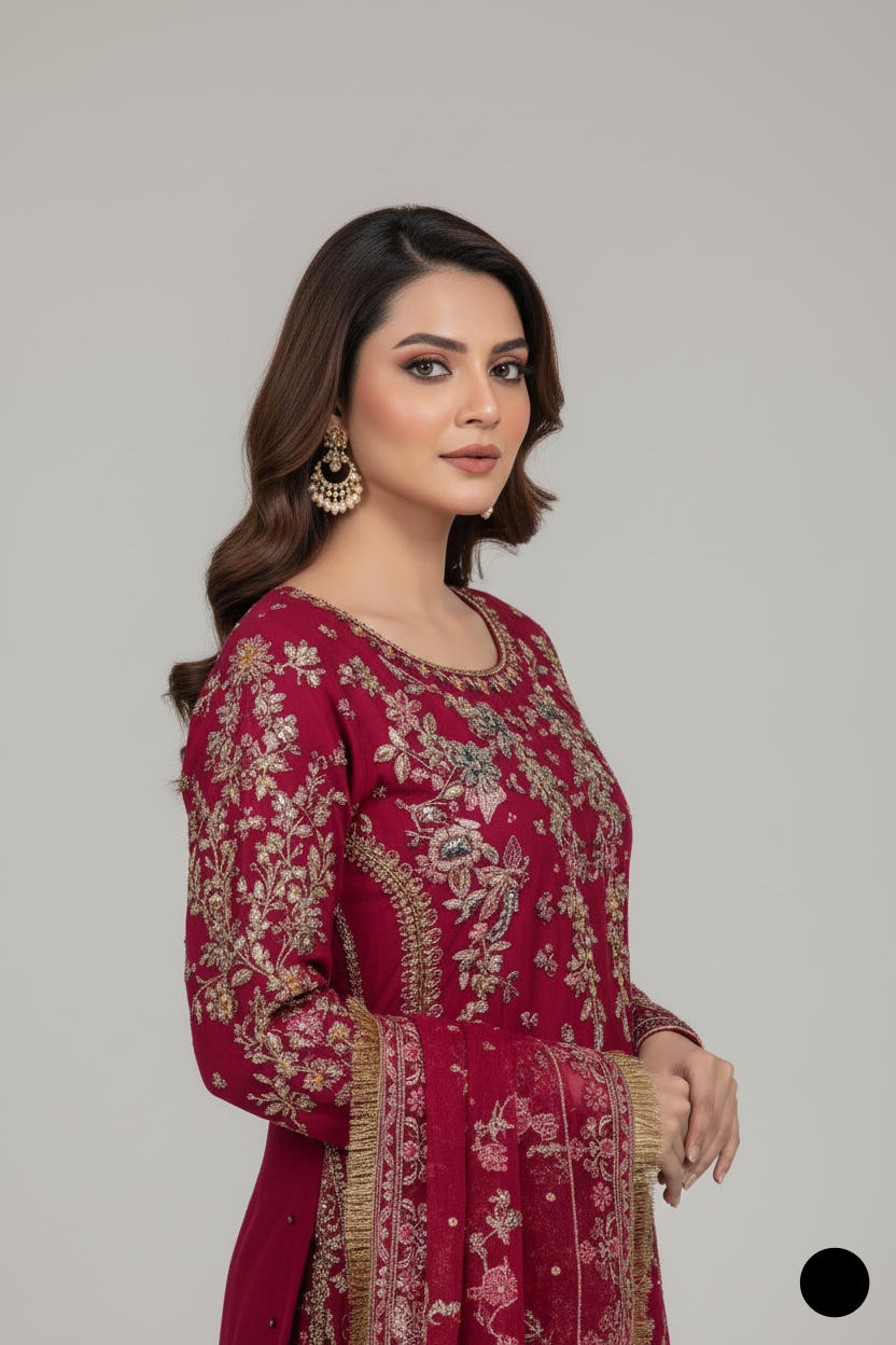 This elegant ensemble features a lightweight chiffon shirt that offers a graceful drape and refined look. It is paired with a comfortable grip fabric trouser for a sleek silhouette. The outfit is completed with a delicate chiffon dupatta, adding a touch of sophistication. Designed in a straight shirt style, the shirt has a length of 45 to 47 inches and the total weight of the outfit is approximately 1.450 KG — making it perfect for semi-formal and formal occasions.