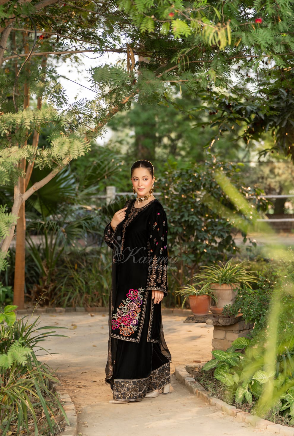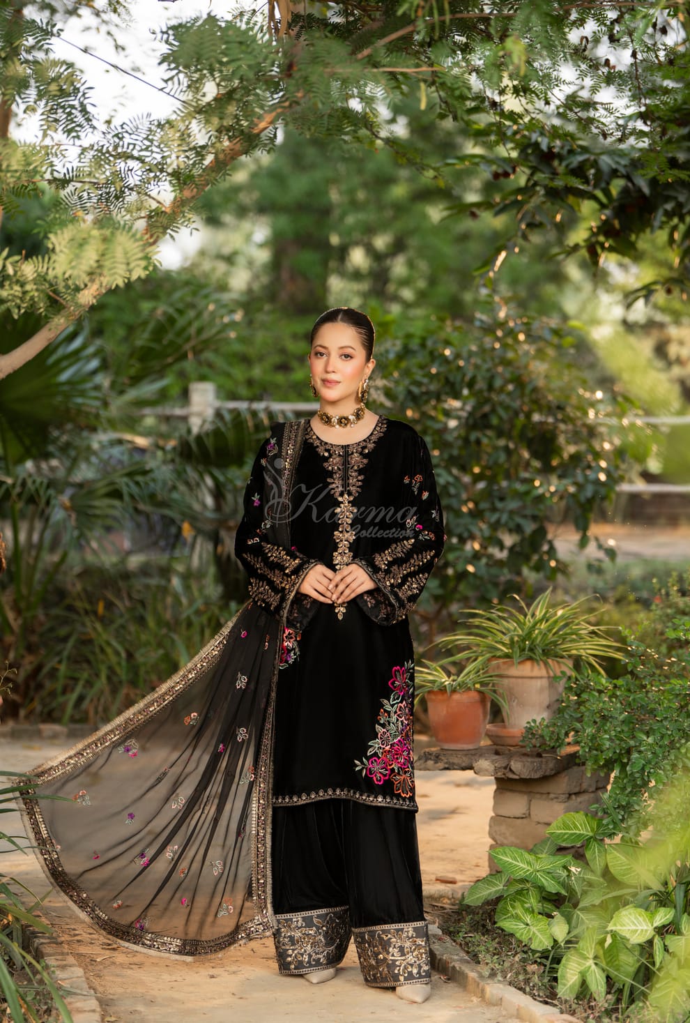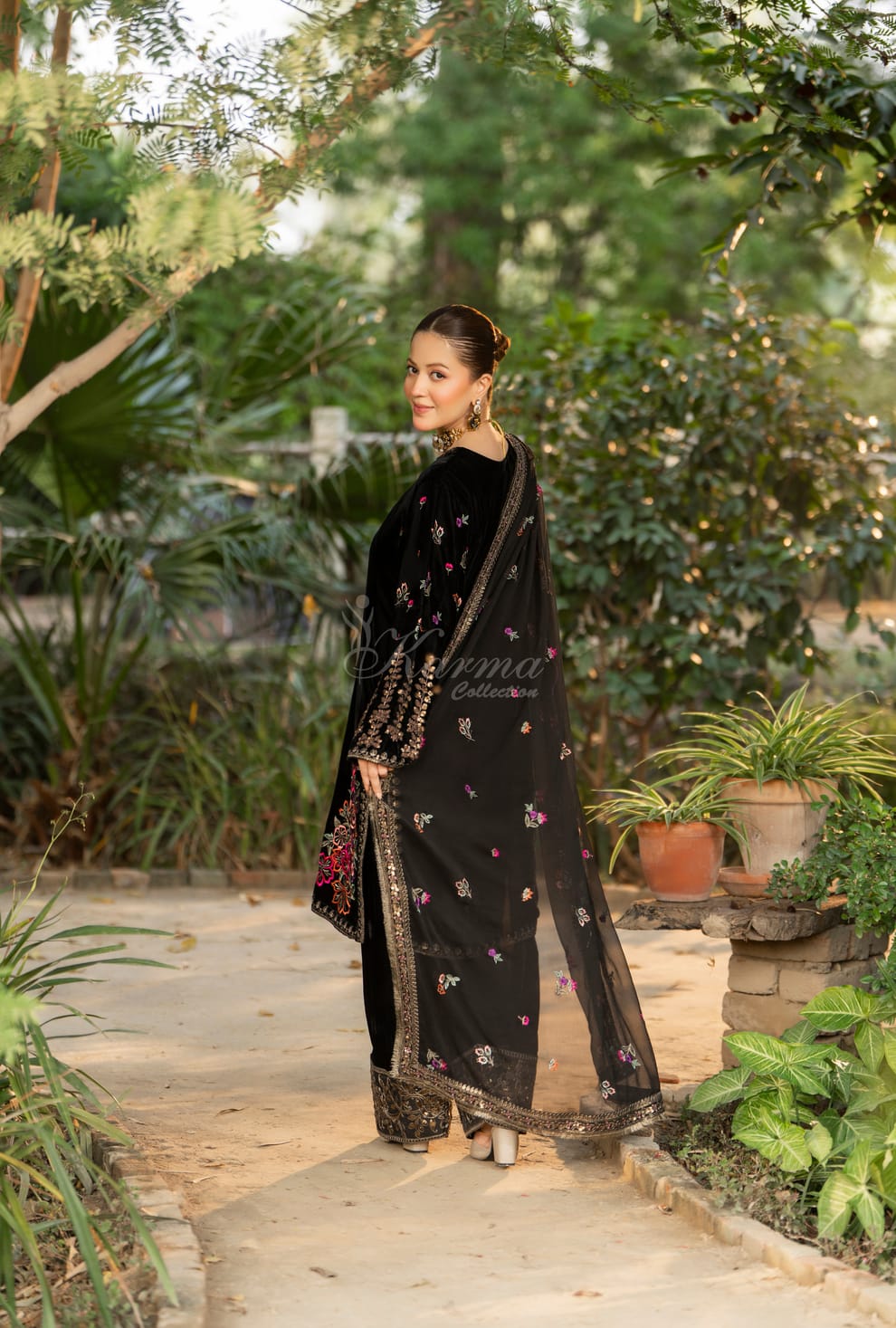 This elegant outfit features a luxurious velvet shirt paired with matching velvet trousers, offering a rich and sophisticated look. The chiffon dupatta adds a graceful, lightweight contrast to the ensemble. Designed in a classic Shirt With Shalwar style, the shirt measures 38/40 inches in length and provides a refined traditional appearance. With a total weight of 1.000, this outfit is comfortable to wear while maintaining a premium feel.