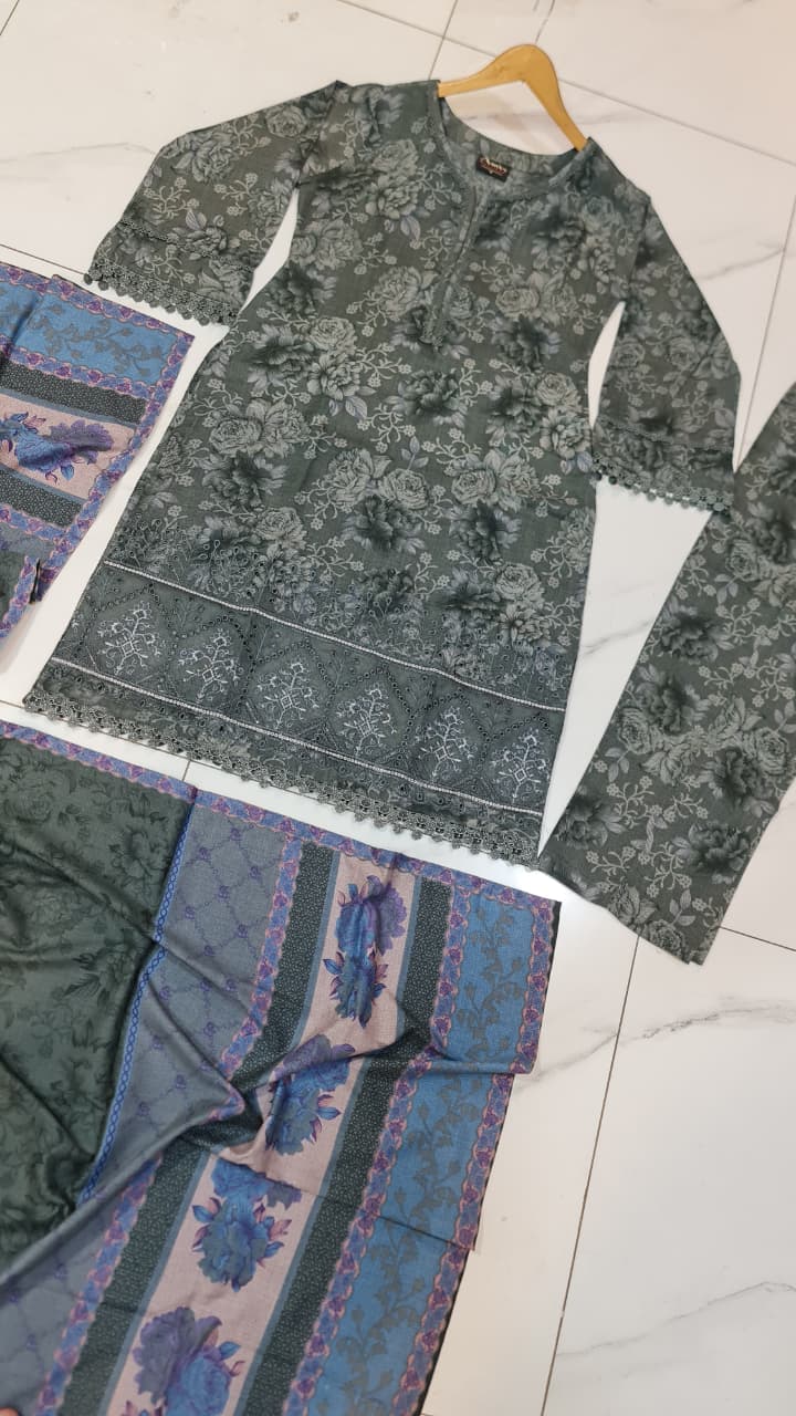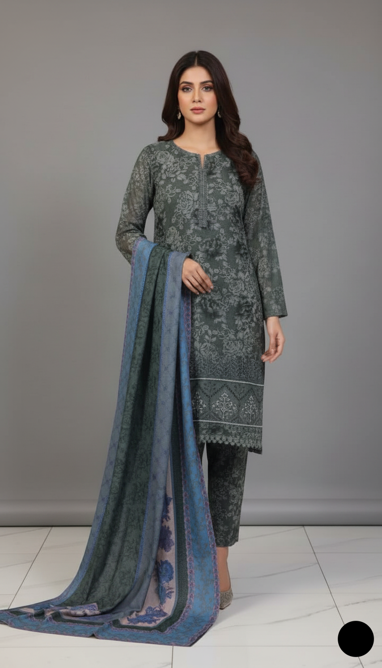This elegant outfit is crafted from soft and warm Dhanak fabric, offering comfort and style for everyday wear. The set features a straight-style shirt paired with matching Dhanak trousers and a beautifully woven Dhanak shawl dupatta for a complete winter-ready look. With a shirt length of 41/43 inches and a total weight of 0.800, the ensemble ensures effortless grace, durability, and a cozy feel perfect for the season.
