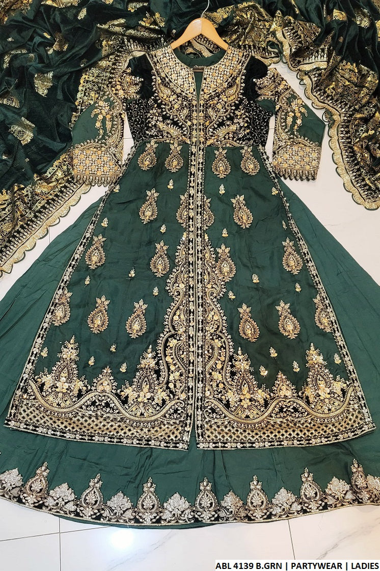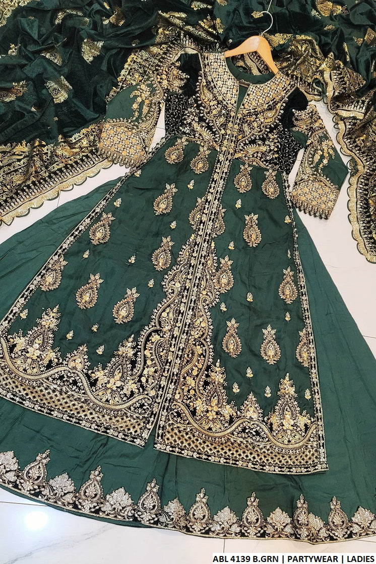 1. The outfit is a luxurious and eye-catching ensemble, featuring a shirt made from delicate organza fabric, which adds a sheer and elegant touch, while the lehenga is crafted from grip fabric, ensuring a structured and comfortable fit. The dupatta, made from plush velvet, introduces a rich and opulent texture to the overall look. Designed as an open A-line shirt with lehenga, the shirt has a length of 52/54, creating a flowing and modern silhouette. Weighing 2.300 kg, the outfit has a substantial and regal feel, making it perfect for grand celebrations or formal events. The combination of organza, grip fabric, and velvet, paired with the open A-line shirt and lehenga style, results in a striking and sophisticated look that exudes elegance and charm.