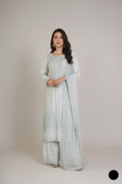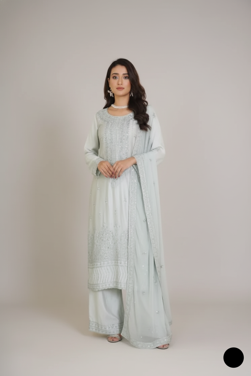 This elegant 3-piece outfit is a perfect blend of luxury and comfort, featuring a silk straight shirt with a longer, graceful shirt length of 44 to 46 inches for a flattering and refined look. The ensemble is paired with a grip fabric plazo, offering a modern and flowy silhouette that enhances movement and style. The look is completed with a soft and airy chiffon dupatta, adding a light, elegant touch. Weighing 0.700 kg, this suit is ideal for formal events, festive gatherings, or any occasion where you want to dress with sophistication.