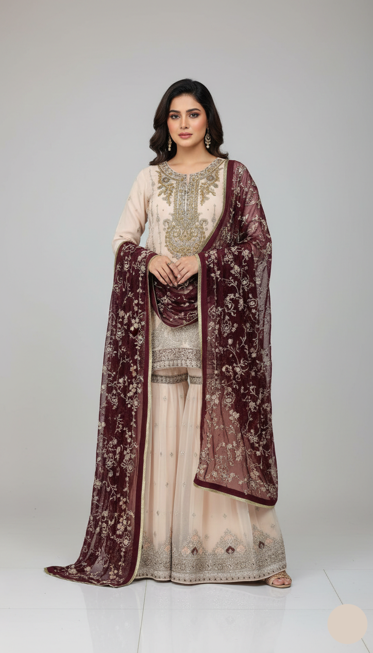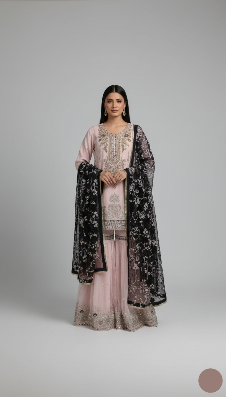 - This elegant ensemble features a chiffon shirt paired with a matching chiffon gharara, creating a beautiful and graceful silhouette. The shirt, with a length ranging from 34 to 36 inches, offers a chic and flattering fit, while the gharara adds a flowy, feminine touch. A coordinating chiffon dupatta completes the outfit, enhancing its overall elegance. Weighing 0.950 kg, this lightweight attire ensures both comfort and style, making it an ideal choice for formal and festive occasions.