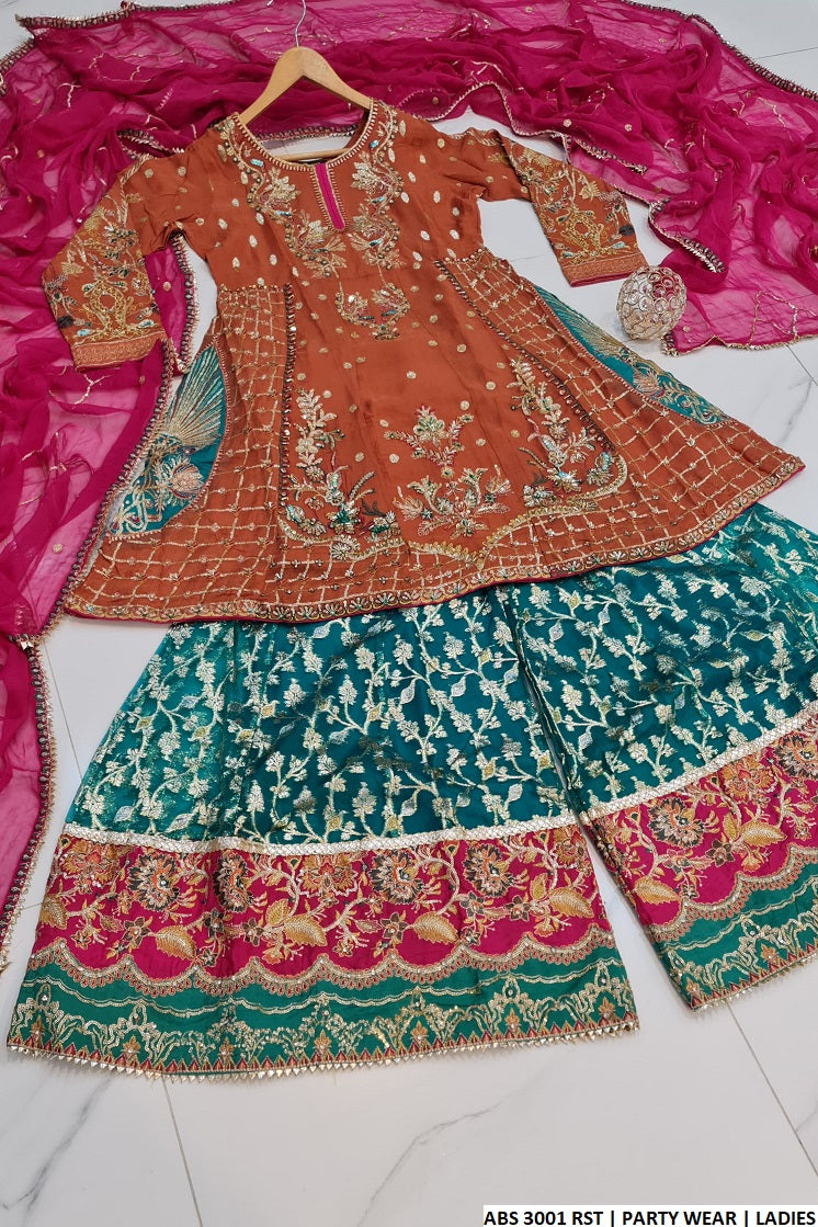 - This elegant outfit features a chic frock with a plaza style, crafted from luxurious fabrics for a sophisticated look. The shirt is made from delicate chiffon, offering a lightweight and flowy feel, while the trousers are designed with grip fabric for a comfortable and secure fit. Adding a touch of glamour, the dupatta is crafted from zari organza, exuding a subtle shimmer and elegance. The shirt length measures 38/40, ensuring a perfect fit, and the entire ensemble weighs approximately 1.250 kg, making it both stylish and easy to wear. This combination of fabrics and design creates a harmonious blend of comfort and fashion, ideal for any special occasion.