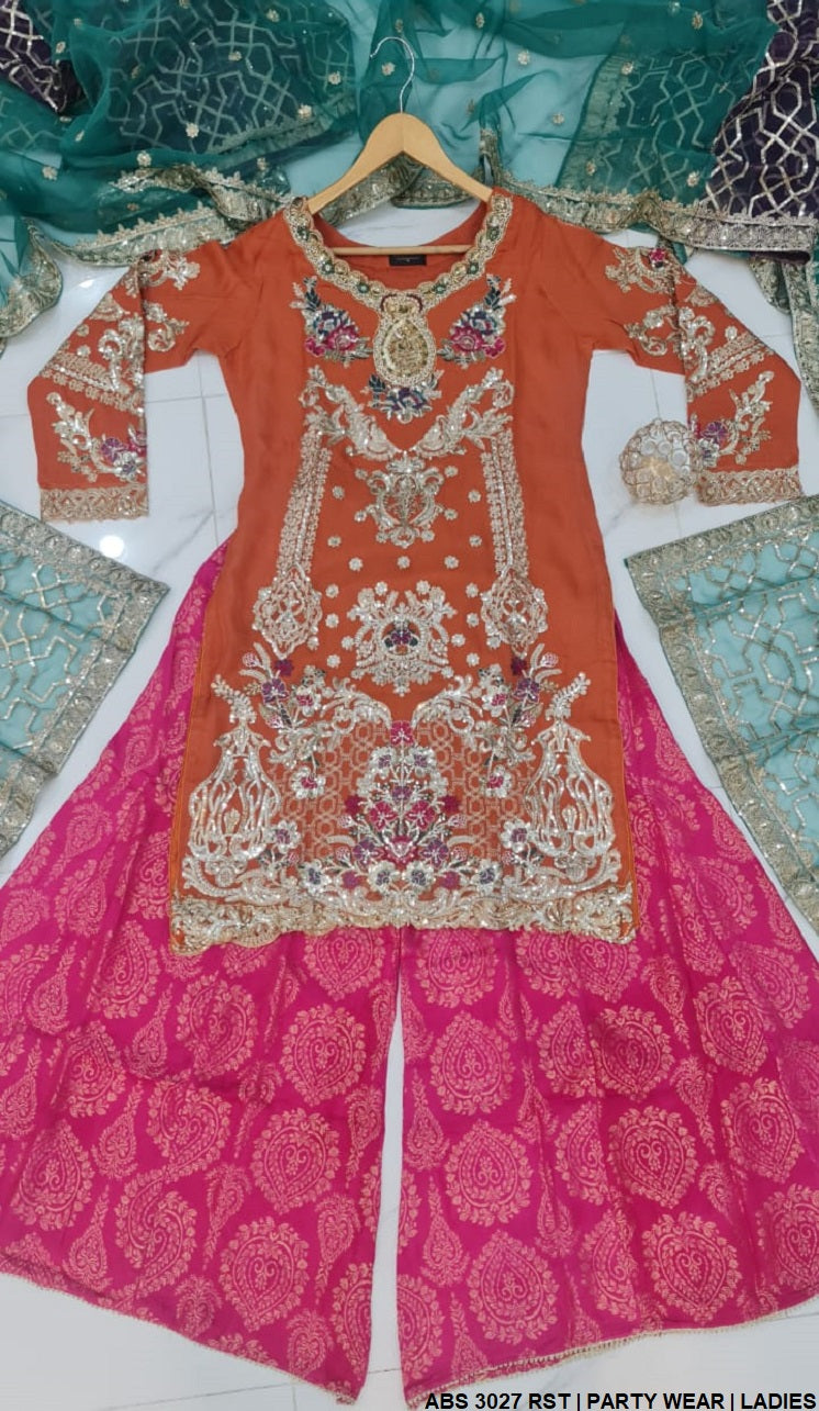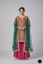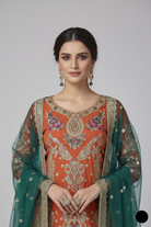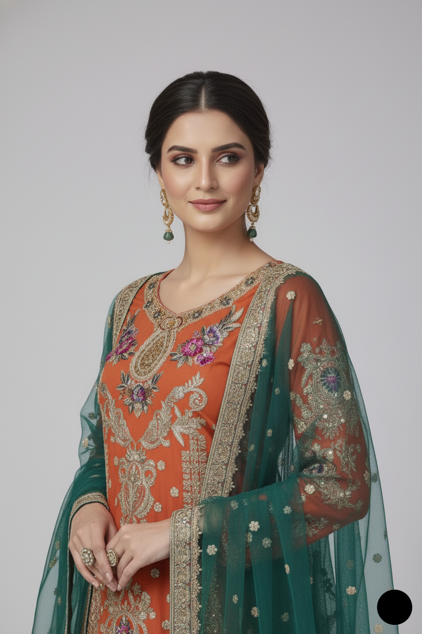 This stylish ensemble features a shirt made from chiffon, offering a lightweight and elegant drape. The shirt, with a length of 37 to 39 inches, provides a refined and flattering silhouette. It is paired with a sharara crafted from jamawar fabric, adding a touch of traditional luxury with its intricate pattern and comfortable fit. Completing the look is a matching organza dupatta, adding an extra layer of sophistication. Weighing approximately 1.050 kg, this ensemble combines style, comfort, and elegance, making it a perfect choice for special occasions